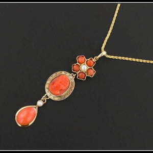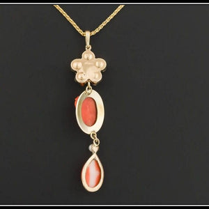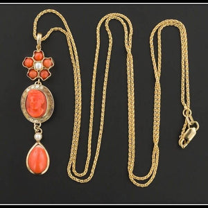 This necklace was originally three 10k/14k gold pins that we transformed into a pendant by welding them together and adding a 14k gold bale at the top. A versatile statement piece when on a long or short chain, this piece features a coral and pearl flower, a carved coral cameo and a pearl and coral drop.