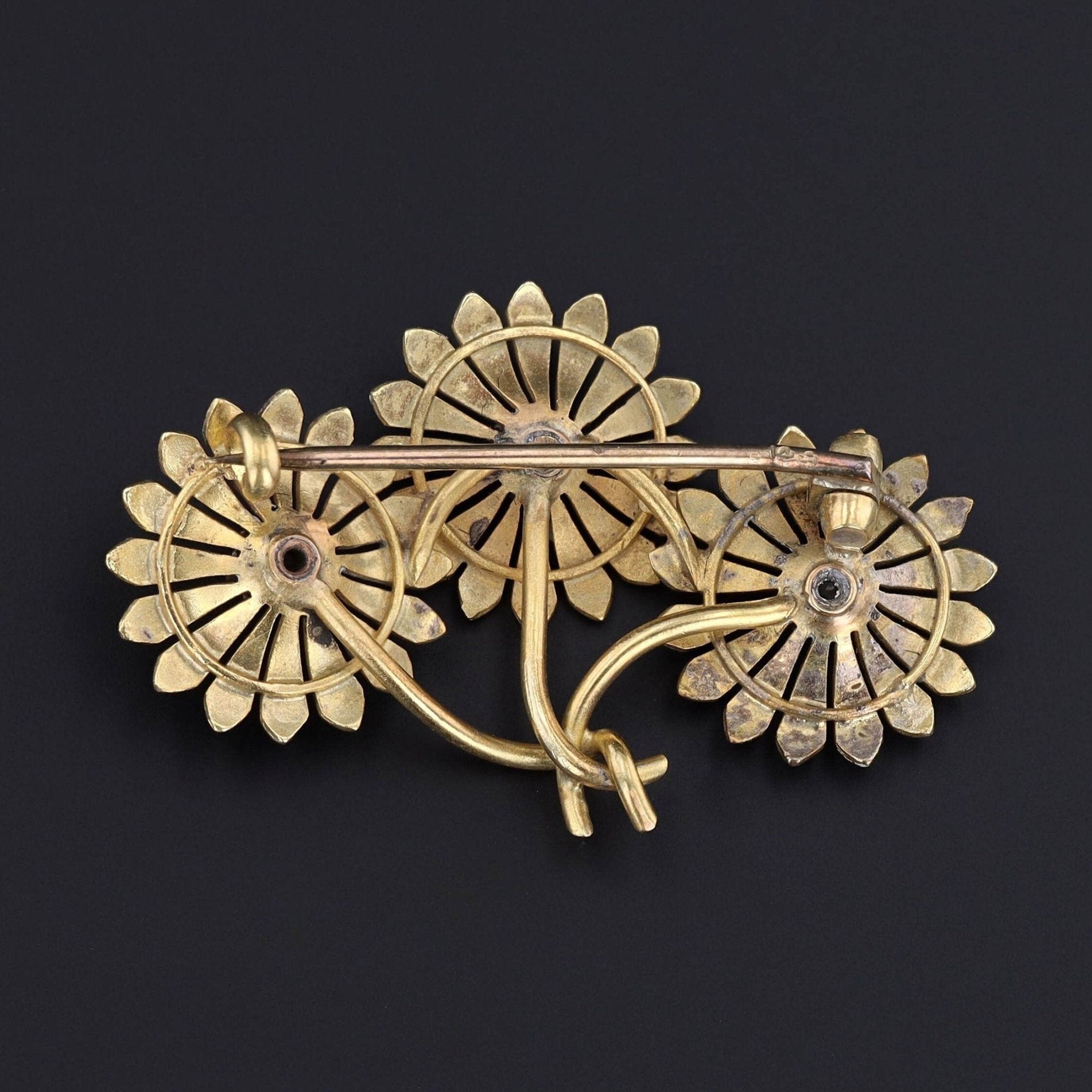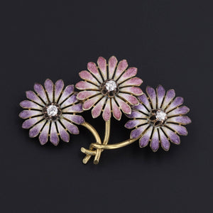 Evoking the elegance and artistry of the Art Nouveau era (circa 1900–1909), this exquisite antique brooch captures the romantic spirit of turn-of-the-century jewelry design. Handcrafted in solid 14k gold, it features three beautifully enameled daisy blossoms in delicate shades of lavender and blush pink, each centered with a glittering old-cut diamond that adds a refined touch of sparkle.