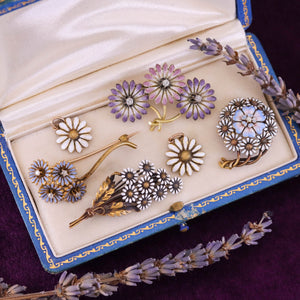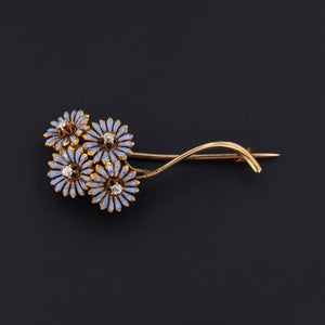 This antique brooch (circa 1910–1920) depicts a graceful bouquet of daisies, crafted in 14k gold and decorated with soft blue enamel petals accented by sparkling diamonds. The delicate enamel work and naturalistic design reflect the early 20th-century fascination with floral motifs, blending elegance with symbolic meaning—daisies traditionally representing innocence, purity, and new beginnings.