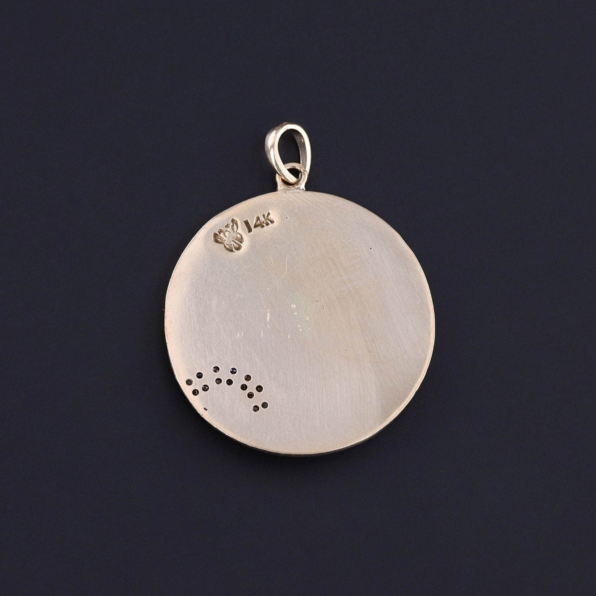 The piece measures 1.25 inches from the top of the bail to bottom by 0.95 inches wide, and it is in great condition.