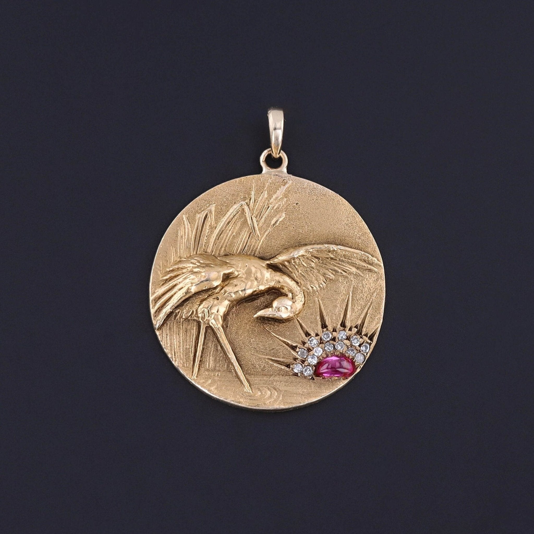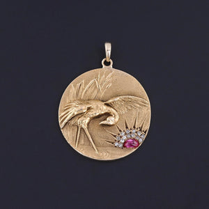 This outstanding pendant was converted from an antique cufflink (circa 1890) by removing the cufflink backing and adding a 14k bail. The 14k gold piece features a crane in a marsh with a ruby and diamond sun setting in the background.
