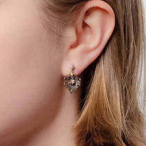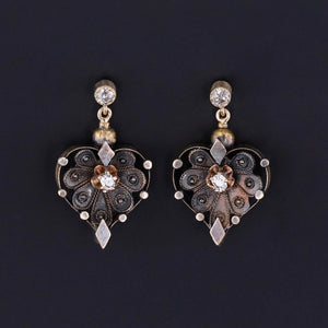 These elegant dangles feature hearts of darkened 14k gold with diamond accents. The hearts were originally part of an antique pin (circa 1890) that our jeweler transformed into earrings by adding diamond surmounts and 14k yellow gold posts.