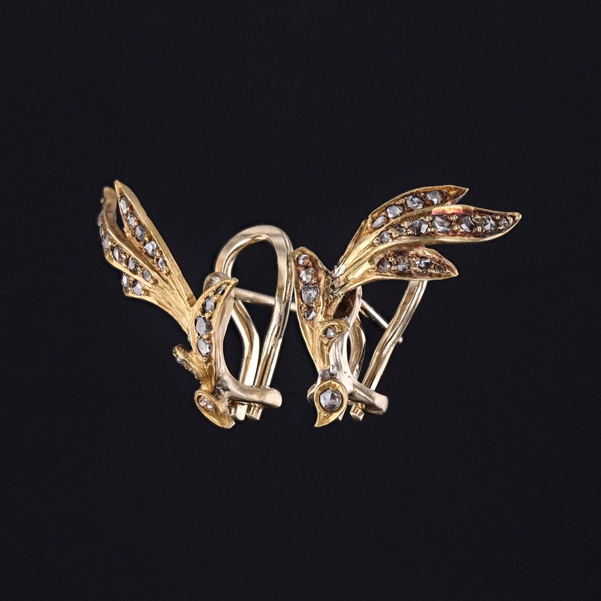 The diamond components were originally part of an antique 18k gold brooch (circa 1880) that our jeweler transformed by adding 14k yellow gold posts and omega backs.