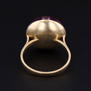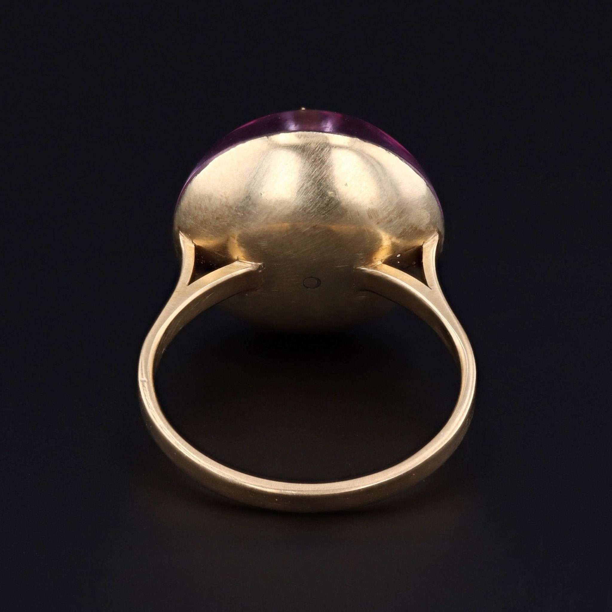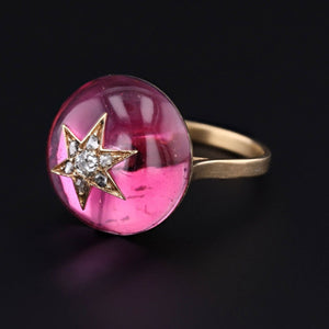 This colorful domed quartz and diamond star ring was originally a 14k gold cufflink (circa 1890). The ring features a pale pink quartz with a deeper pink-hued foil backing to enhance the color. The stone is accented with a star that glistens with rose cut diamonds, and our jeweler mounted the piece in 14k gold.