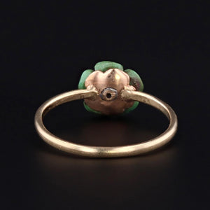 This elegant ring features a hand carved turquoise set with a 0.10ct old mine cut diamond. The ring is mounted in 14k gold.