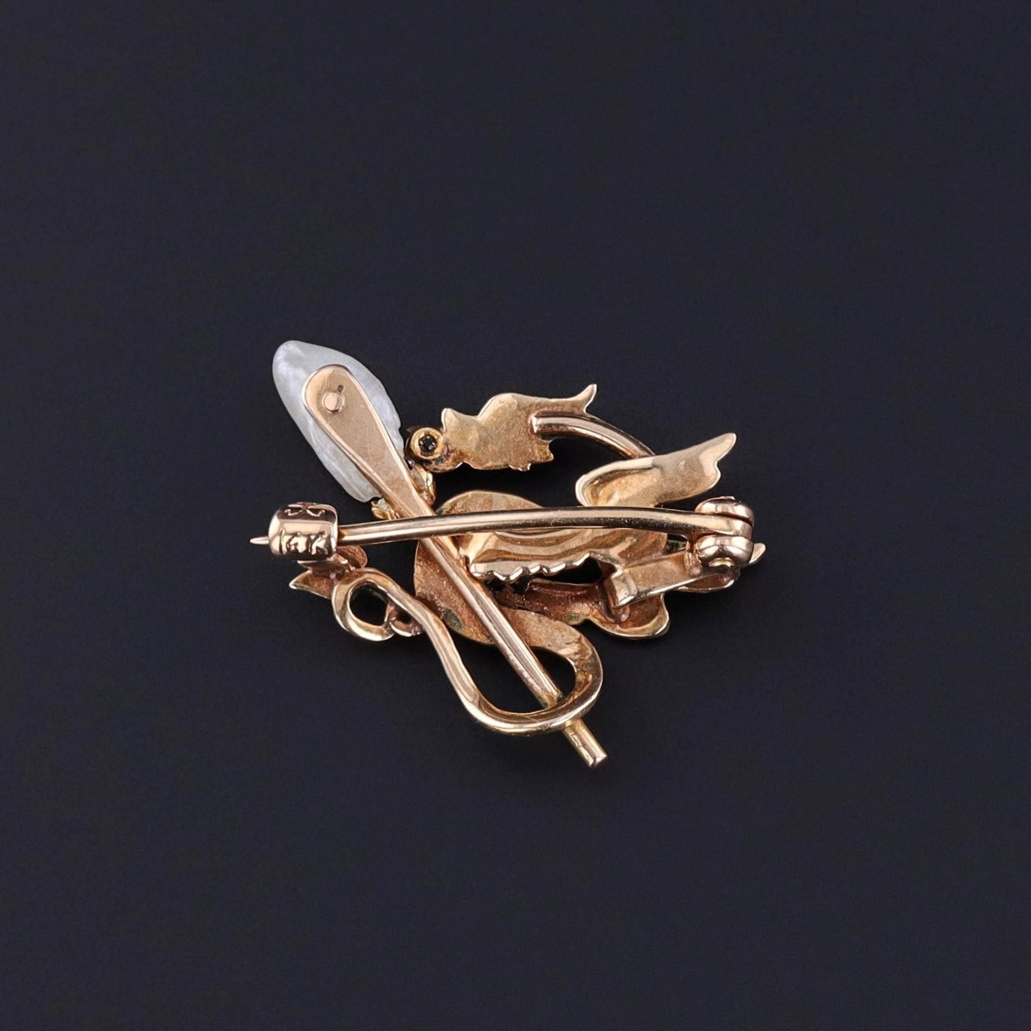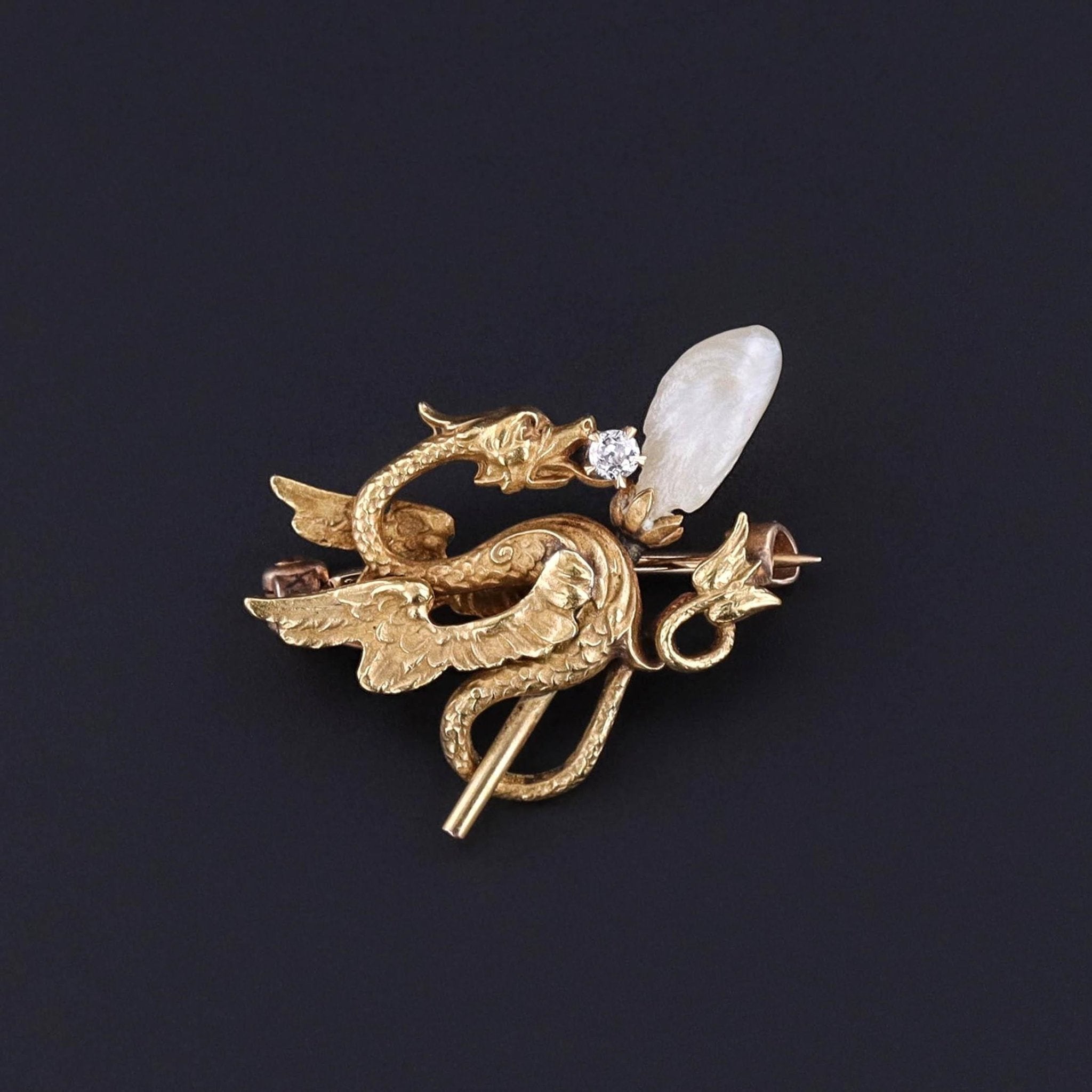 Antique Dragon Brooch: This antique brooch (circa 1910) features a 14k gold dragon with a diamond in its jaws coiled around a Baroque pearl staff. The pin finding bears the makers mark for the renowned Krementz & Co. of Newark, NJ.