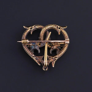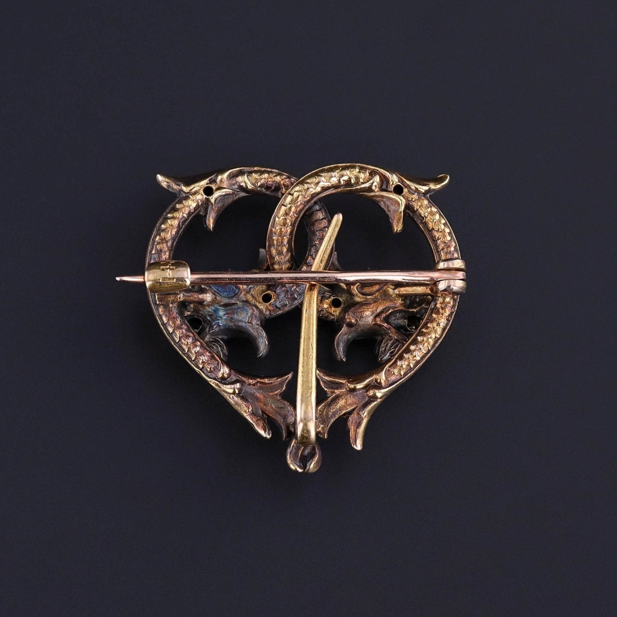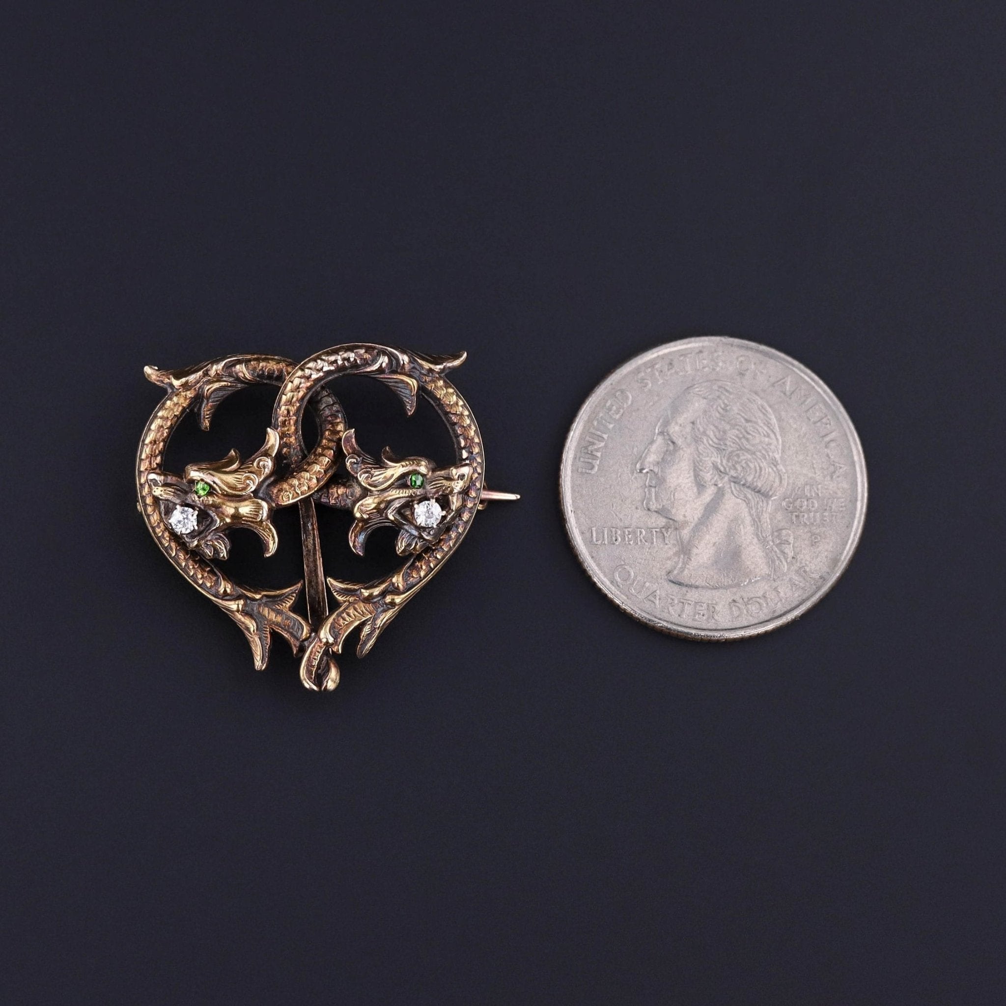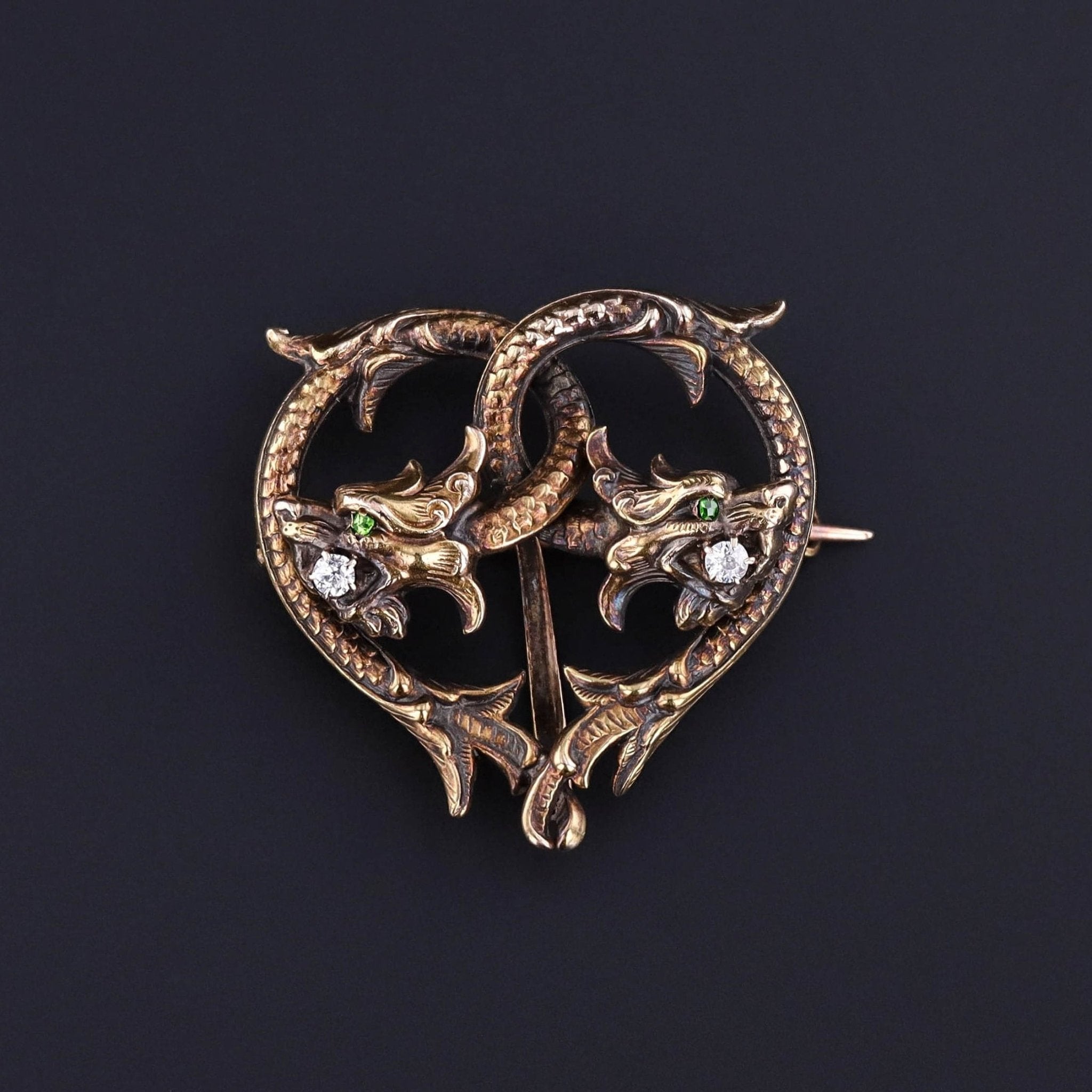 This antique watch pin (circa 1900) features two dragons or griffins of 14k gold with diamonds in their jaws and demantoid garnet eyes.
