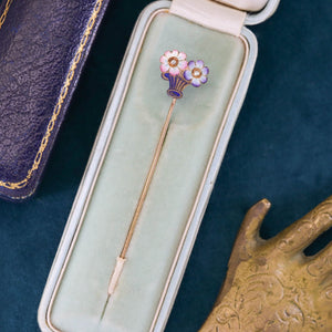 Delicate and romantic, this antique 14k gold stickpin (circa 1890) features a charming basket of two enameled flowers rendered in soft shades of purple, pink, and blue. Two glistening diamond accents nestle among the blooms, adding subtle sparkle to this beautifully detailed miniature.