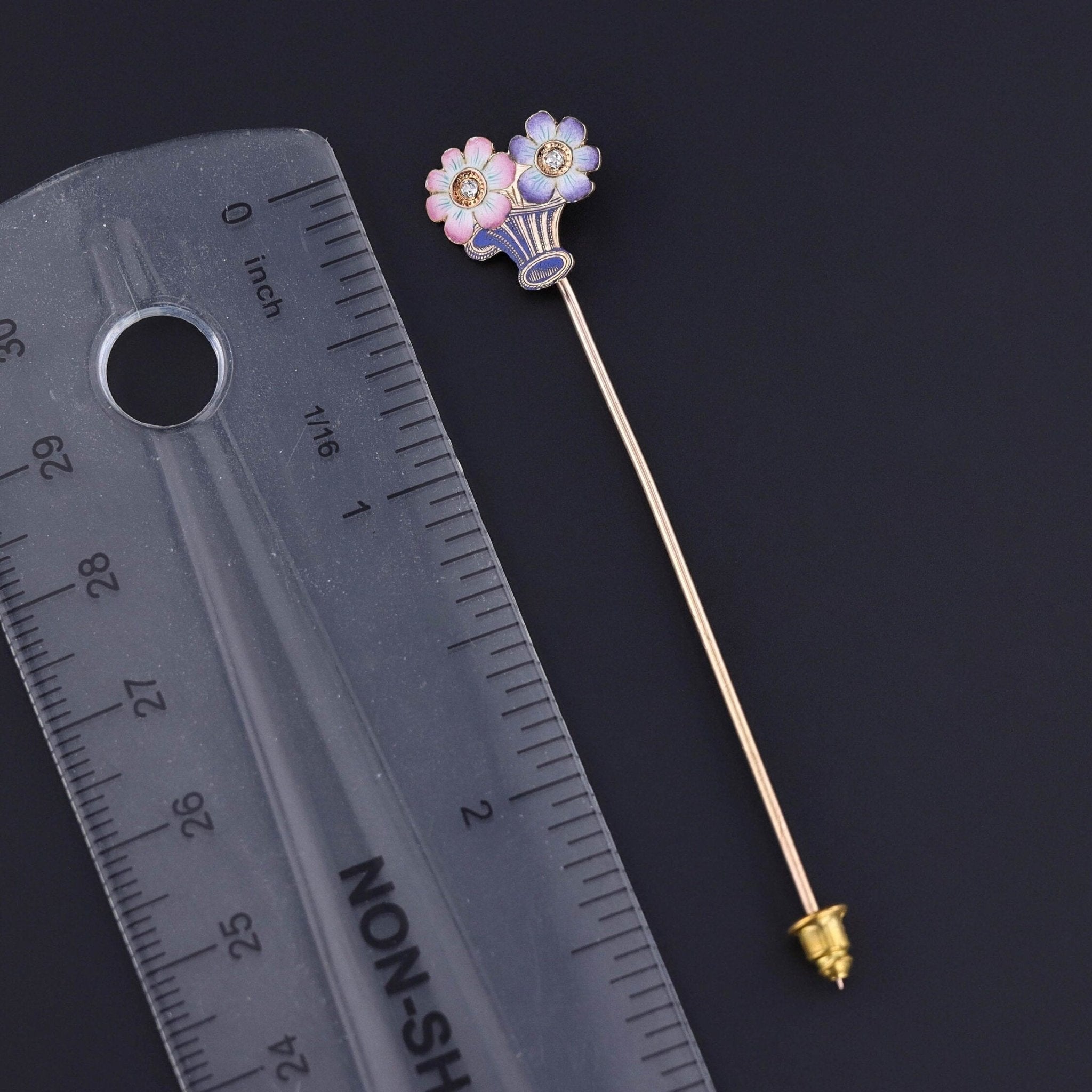 The enamel work remains vibrant and intact, showcasing the craftsmanship of the late Victorian era. The pin head measures approximately 0.5 inches tall by 0.6 inches wide, with the total length of the stickpin at 2.9 inches.