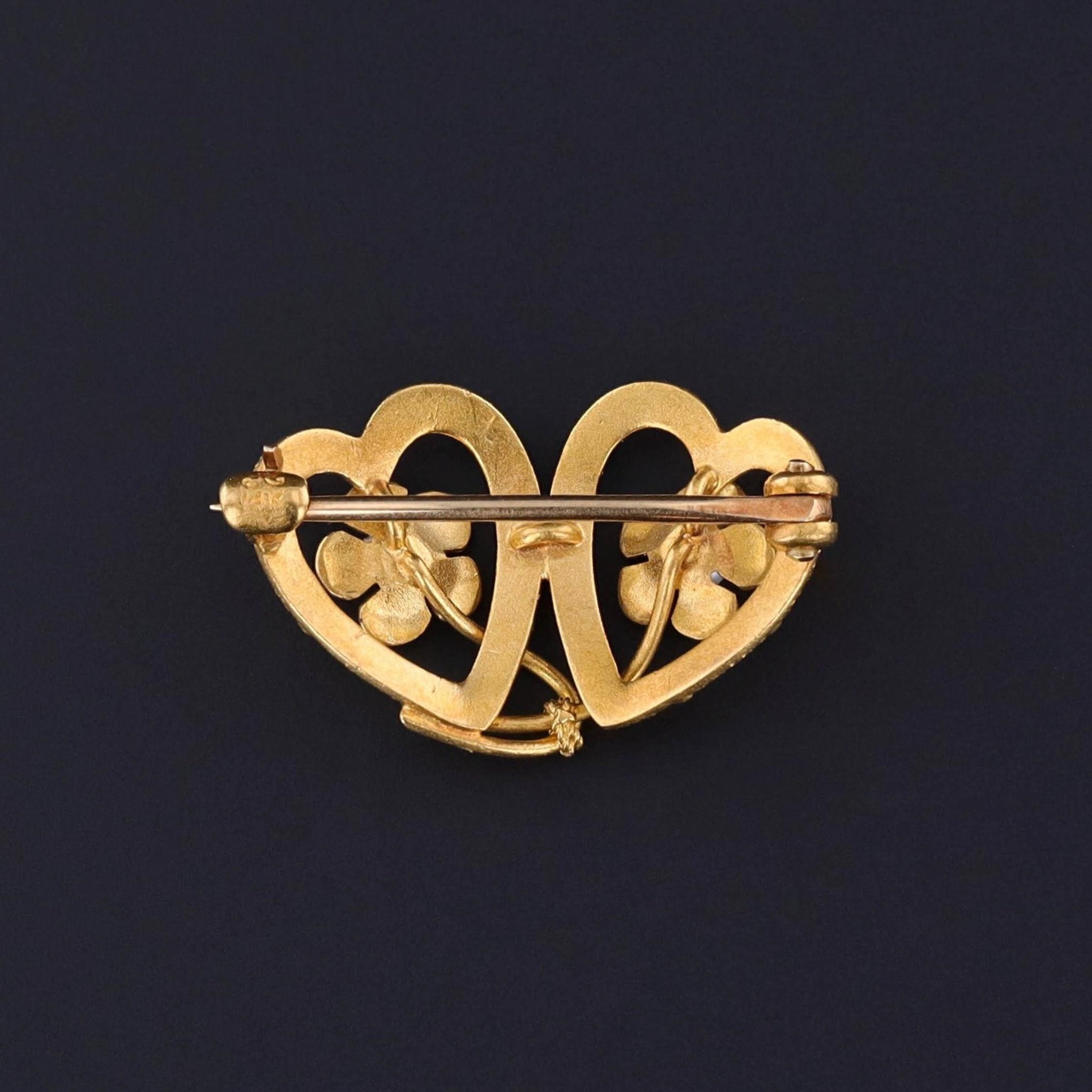 A romantic symbol of everlasting love and devotion, this antique brooch (circa 1890-1910) features two hearts rendered in 14k gold — a timeless motif cherished in Victorian and Edwardian sentimental jewelry. Each heart is delicately adorned with blue enamel forget-me-not flowers, a symbol of remembrance and enduring affection, and accented with lustrous seed pearls for a touch of refined elegance.
