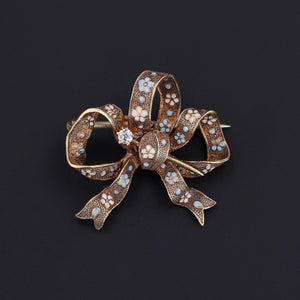 This antique brooch (circa 1910) features a 14k gold ribbon accented with white and blue enamel forget-me-not flowers pierced with a diamond "pin."