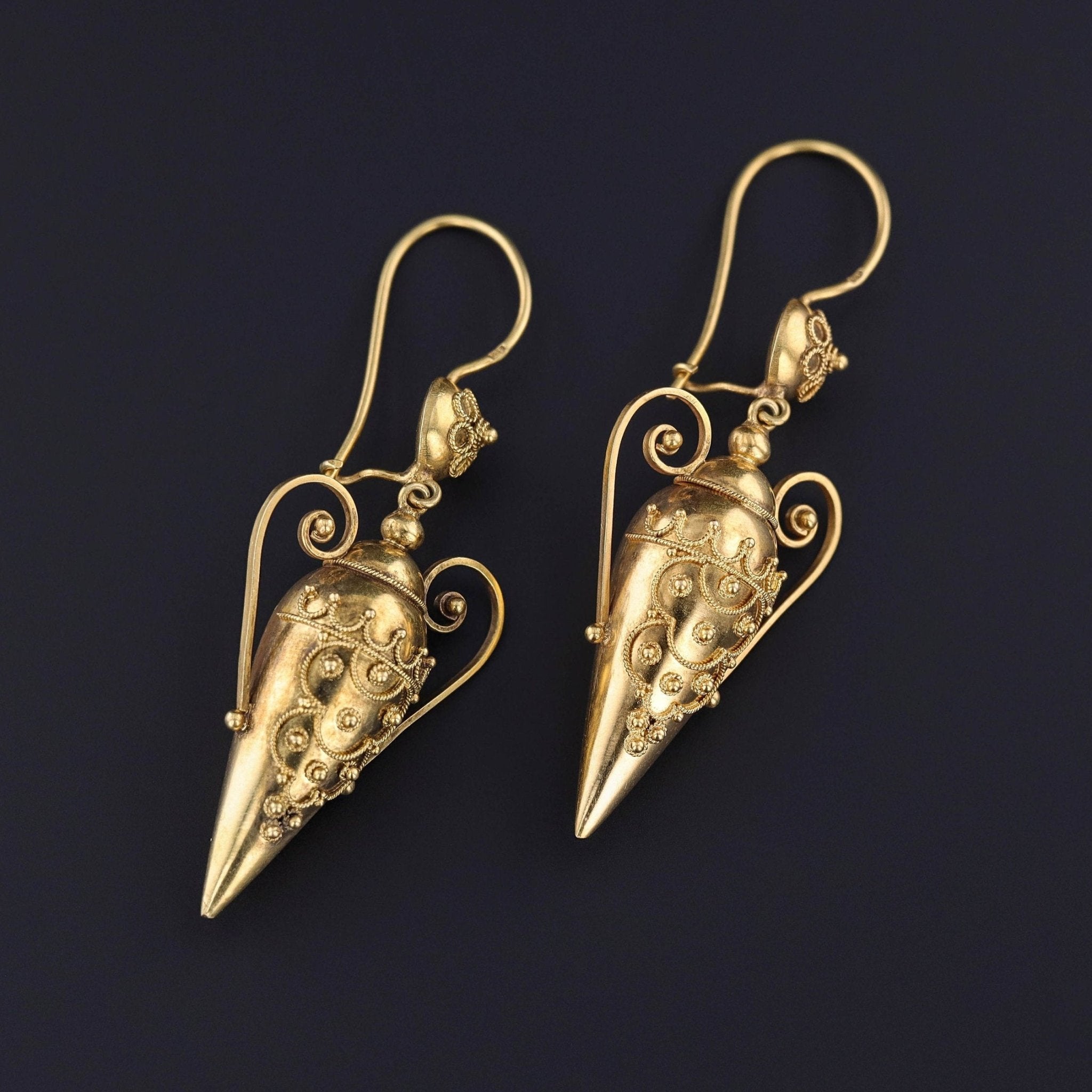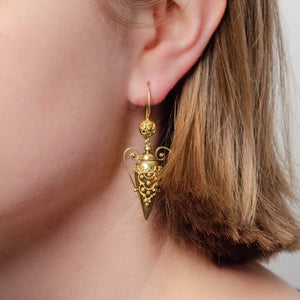 These Victorian era earrings (circa 1870-1890) feature beautifully decorated amphoras or urns of 18k gold. The Etruscan revival dangles are adorned with hand set twisted wire and gold granulation.