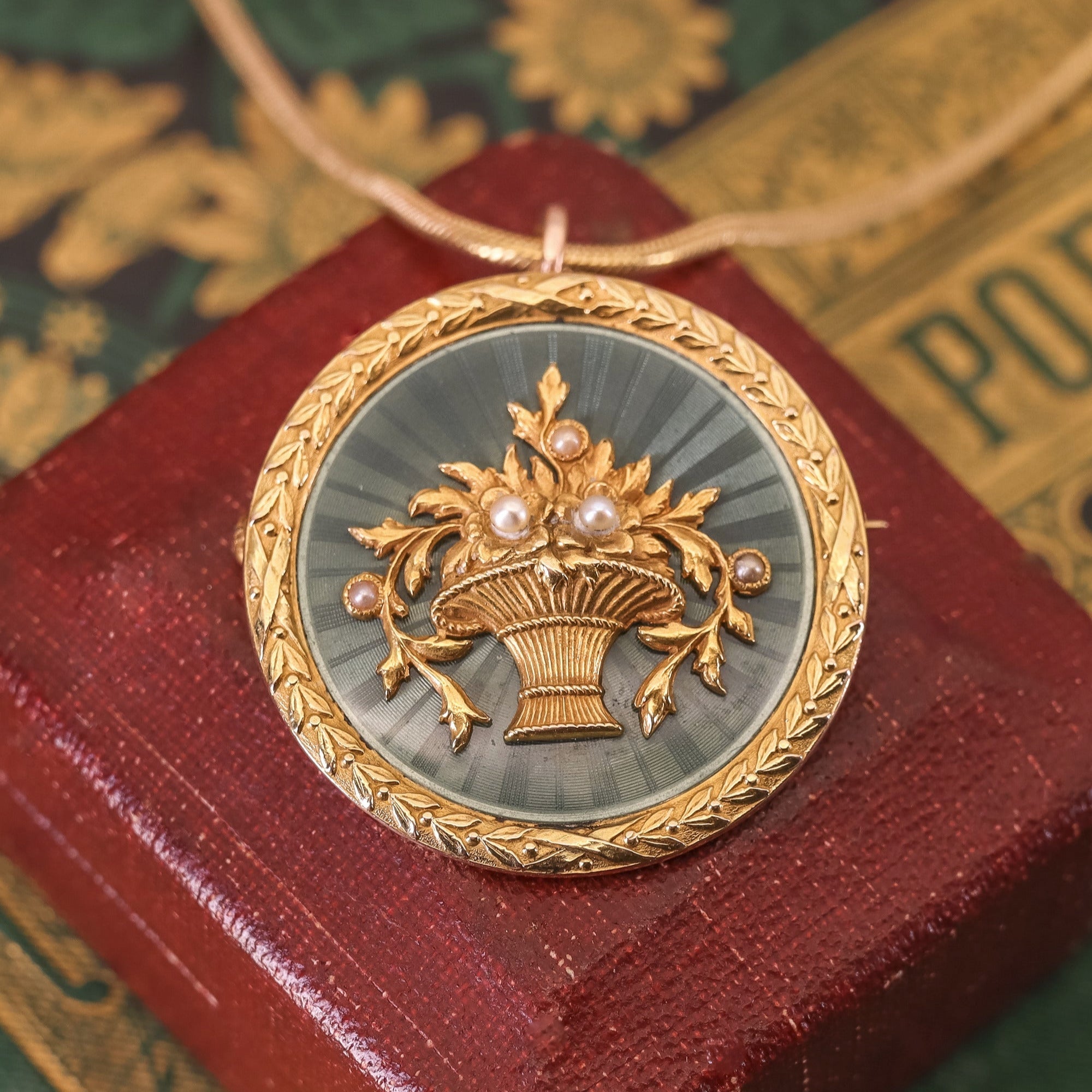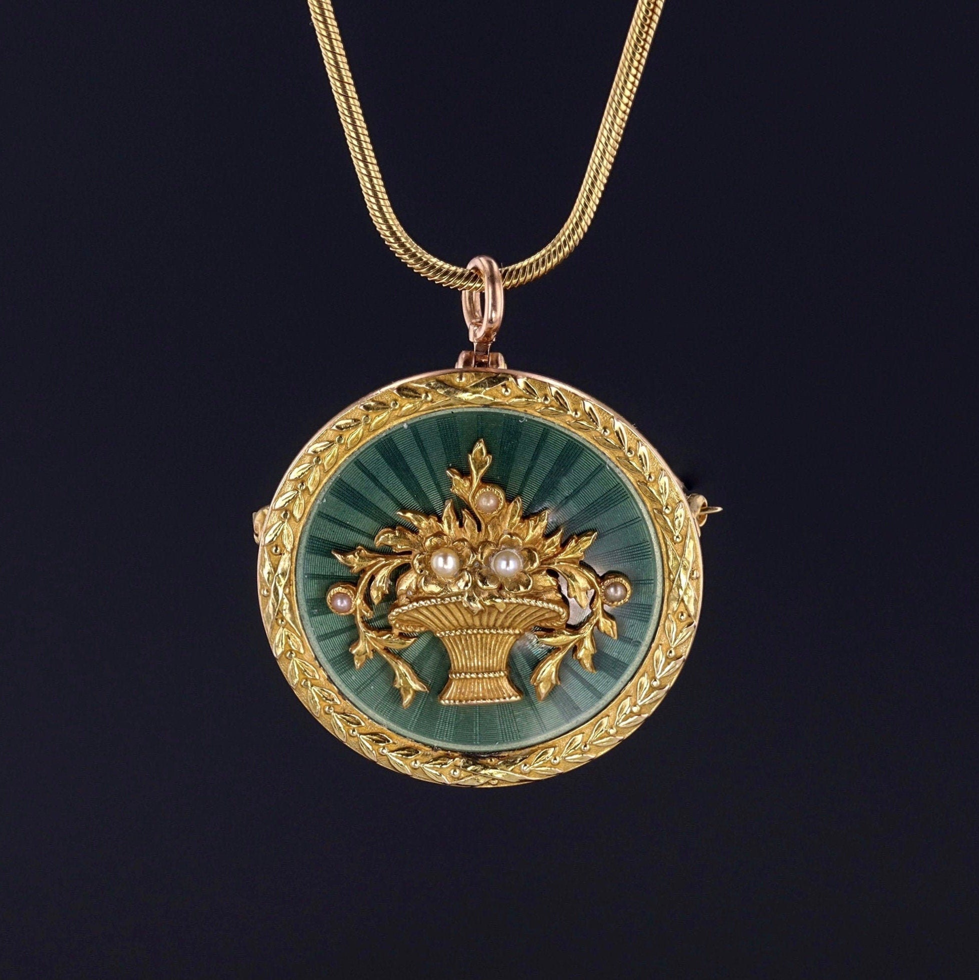Dating to the early 1900s, this versatile piece can be worn as either a pendant or a brooch. The basket motif is beautifully accented with green machine-turned guilloché enamel, a golden floral arrangement, and tiny natural seed pearls, evoking the delicacy and refinement of the Edwardian era. The reverse is stamped with both a 14k gold hallmark and the Carter Gough maker’s mark, underscoring its authenticity and provenance.