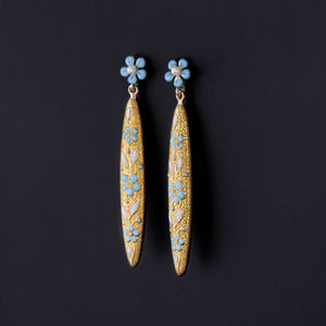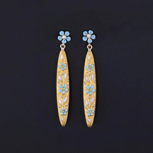 Step into the past with these 14k gold earrings, expertly made from antique pin parts. The earrings feature blue enamel forget-me-not flowers and post set pearls.