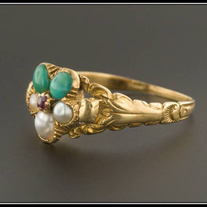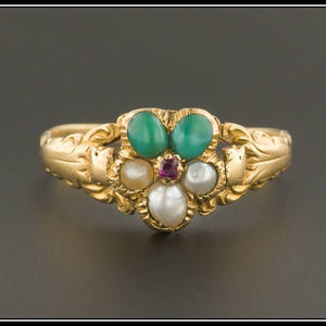 The forget-me-not flower motif was popularly used in love tokens and mourning jewelry during the Victorian period. This gorgeous forget-me-not ring dates to the mid-Victorian period (circa 1845-1865). It features two turquoise cabochons and three half pearls in crimped collet setting with a ruby accent in the middle of the flower. The underside of the ring has a hidden glass compartment holding a lock of hair. The ring is unmarked, but acid tests for 18k gold.