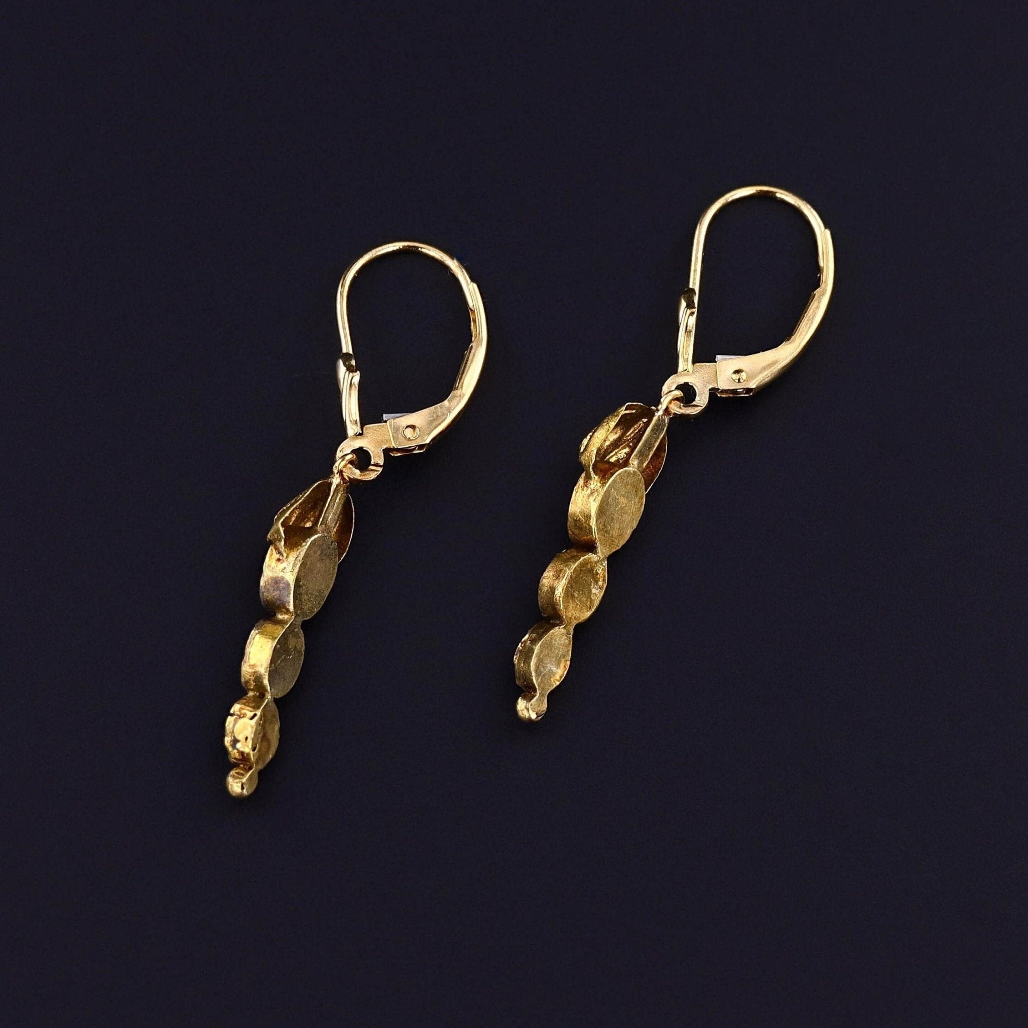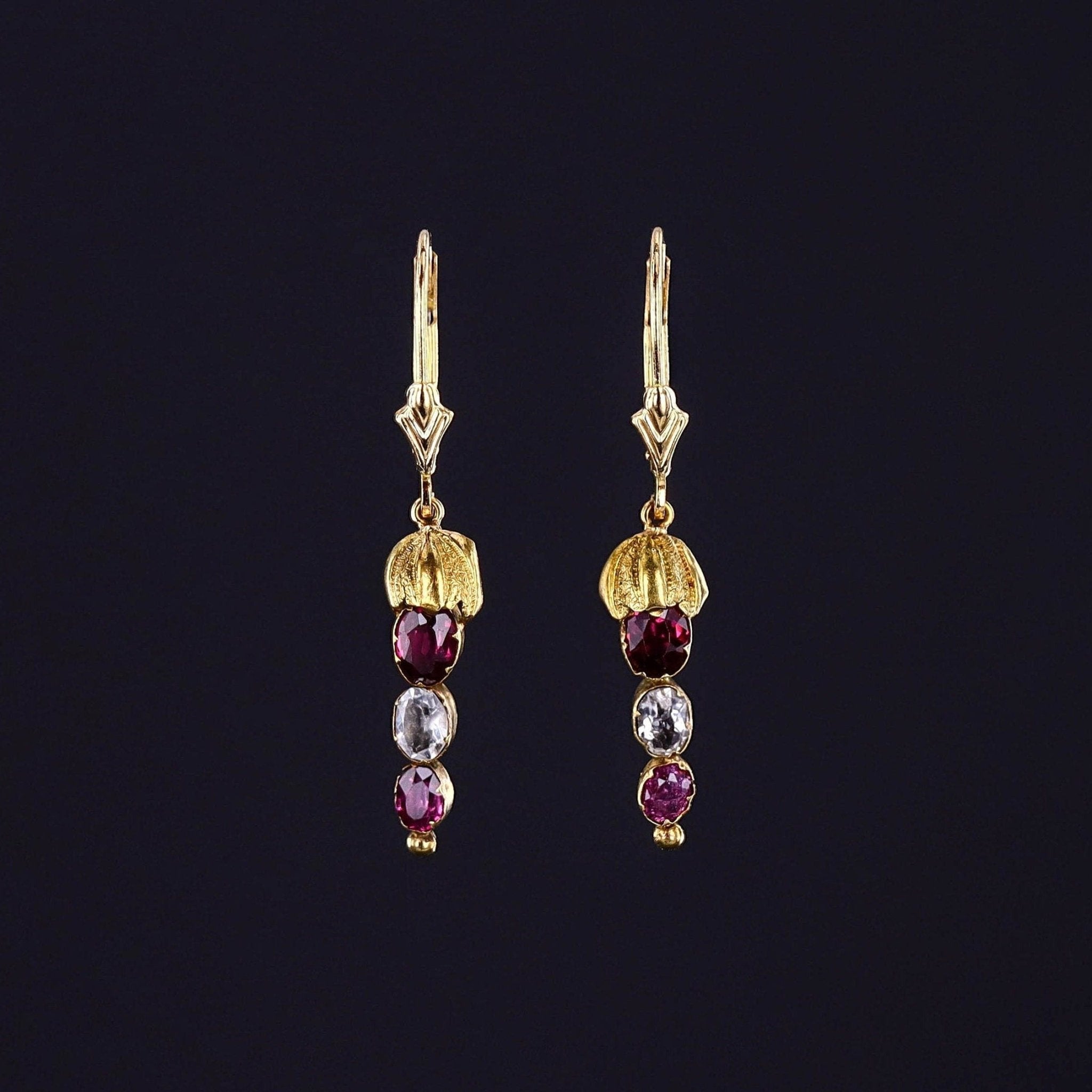 Each earring measures approximately 1.5 inches from the top of the ear wire to the base by 0.25 inches wide, giving them graceful movement and presence. The drops remain in good antique condition, with one garnet showing a stable surface-reaching crack that is visible only under magnification and does not affect wear.