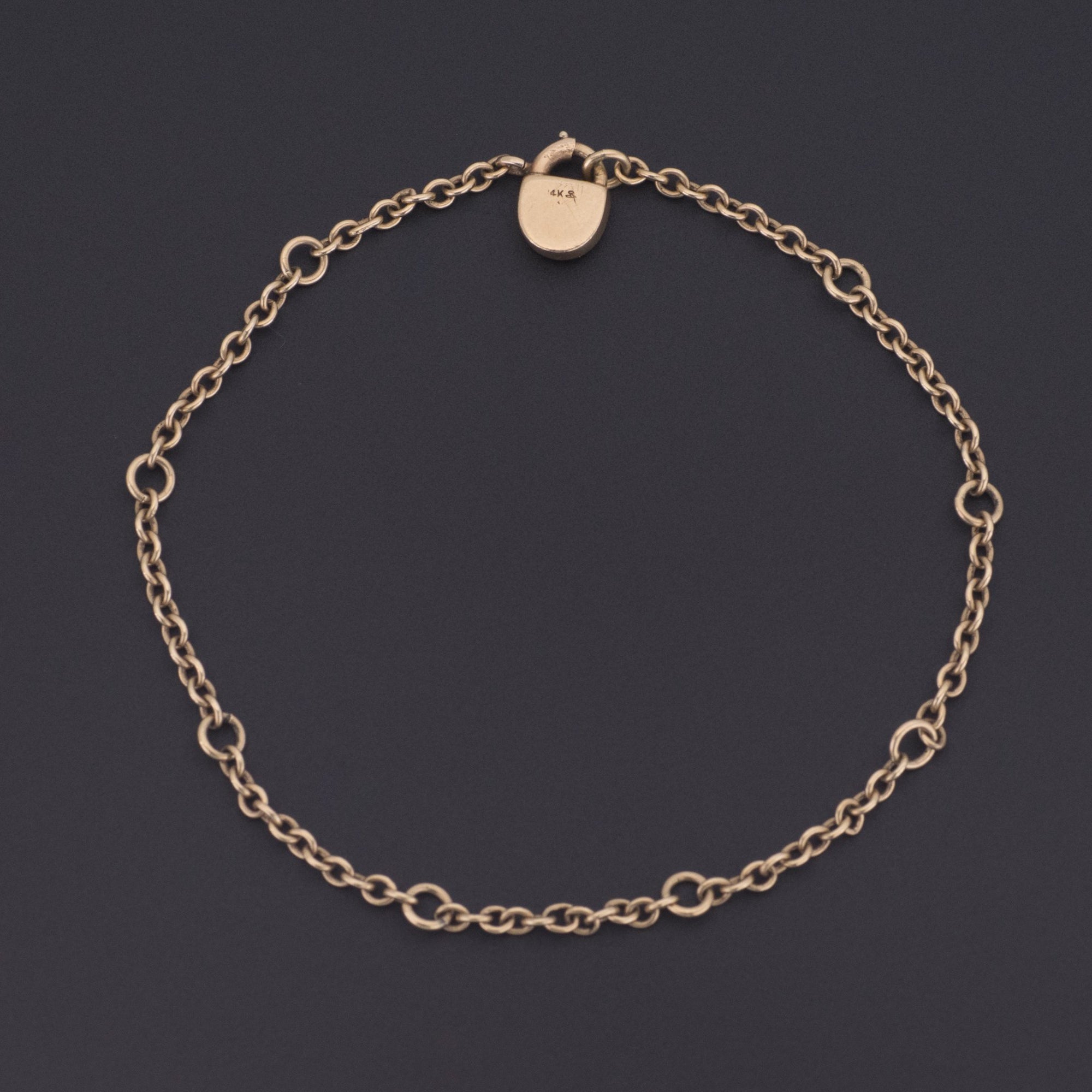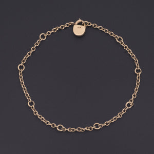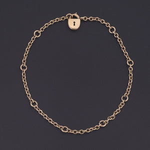 This 14k gold bracelet has stations for the placement of 8 charms and the clasp is a tiny padlock, a symbol of love and commitment.