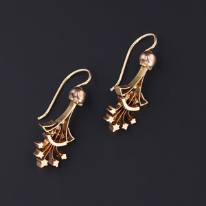 These elegant earrings are 14k gold (unmarked, but acid tested) and measure 1.3 inches from the top of the ear wire to the bottom of the dangles by 0.5 inches wide.