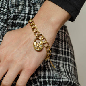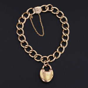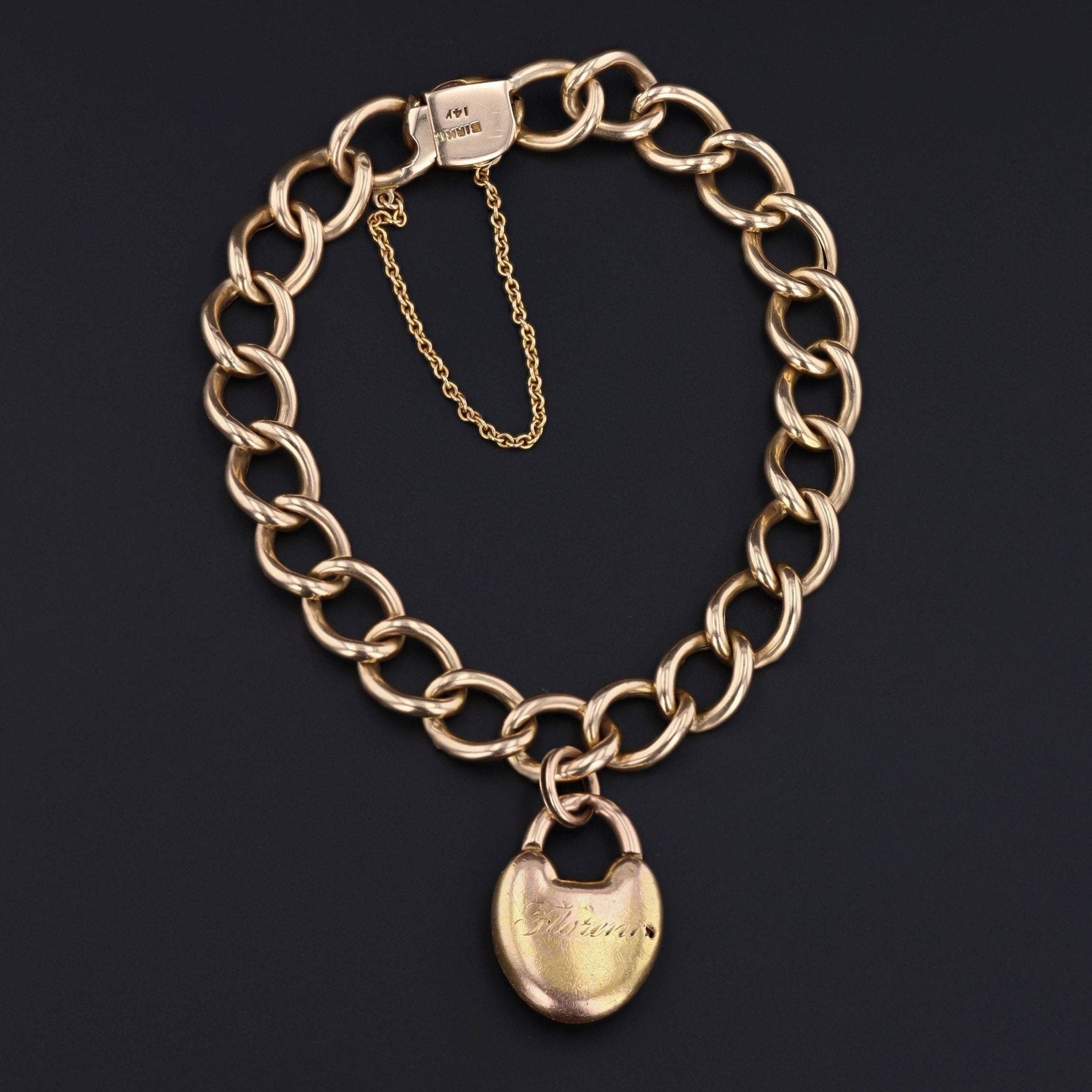 The antique bracelet is marked "Birks 14k" and measures 7 inches long by 0.34 inches wide. It is in good condition; however, there is wear to the enamel on the padlock (visible under close inspection) and the reverse of the heart is engraved "Floreni" with a small pin sized hole.