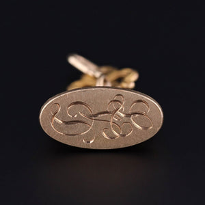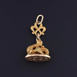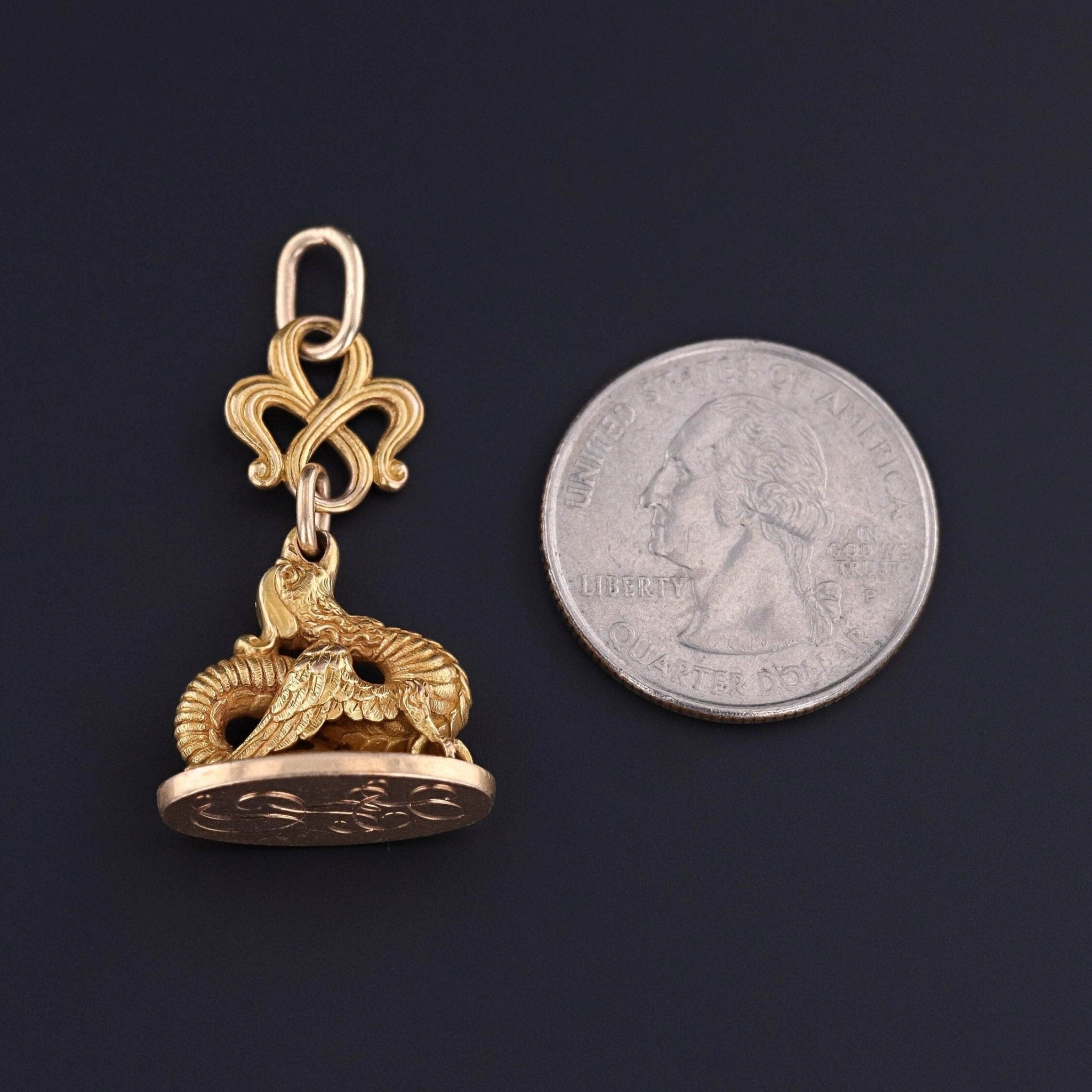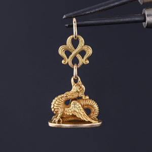 This antique watch fob pendant (circa 1890) features a finely detailed griffin of 18k gold atop a 14k gold base. T he base is engraved with the initials 'LVD'.