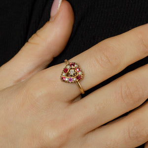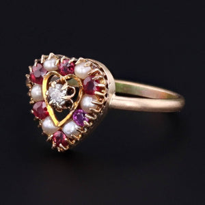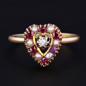 The petite 14k gold ring dons a pearl and red glass heart with a glistening diamond accent at its center.
