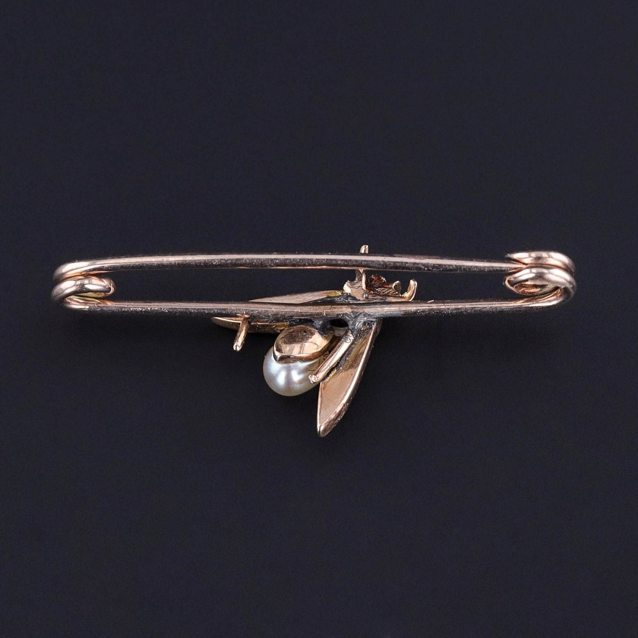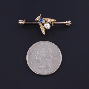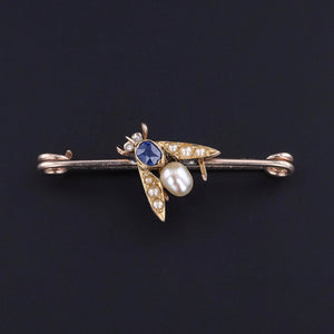 This antique brooch (circa 1890) features an insect adorned with pearls, a strong blue natural sapphire, and diamond eyes set in 14k gold.
