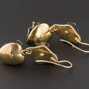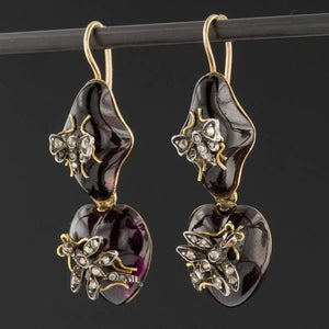 Jewelry incorporating natural and botanical elements reached a peak during the late 19th century spawned in part by curiosity over the discoveries and publications by naturalists like Charles Darwin. These sensual Victorian earrings feature red wine cabochon garnets accented with sparkling diamond butterflies and dragonflies. The earrings are set in 18k yellow gold (unmarked, but acid tested) and the ear wires, which appear to be a later addition, are 10k gold.