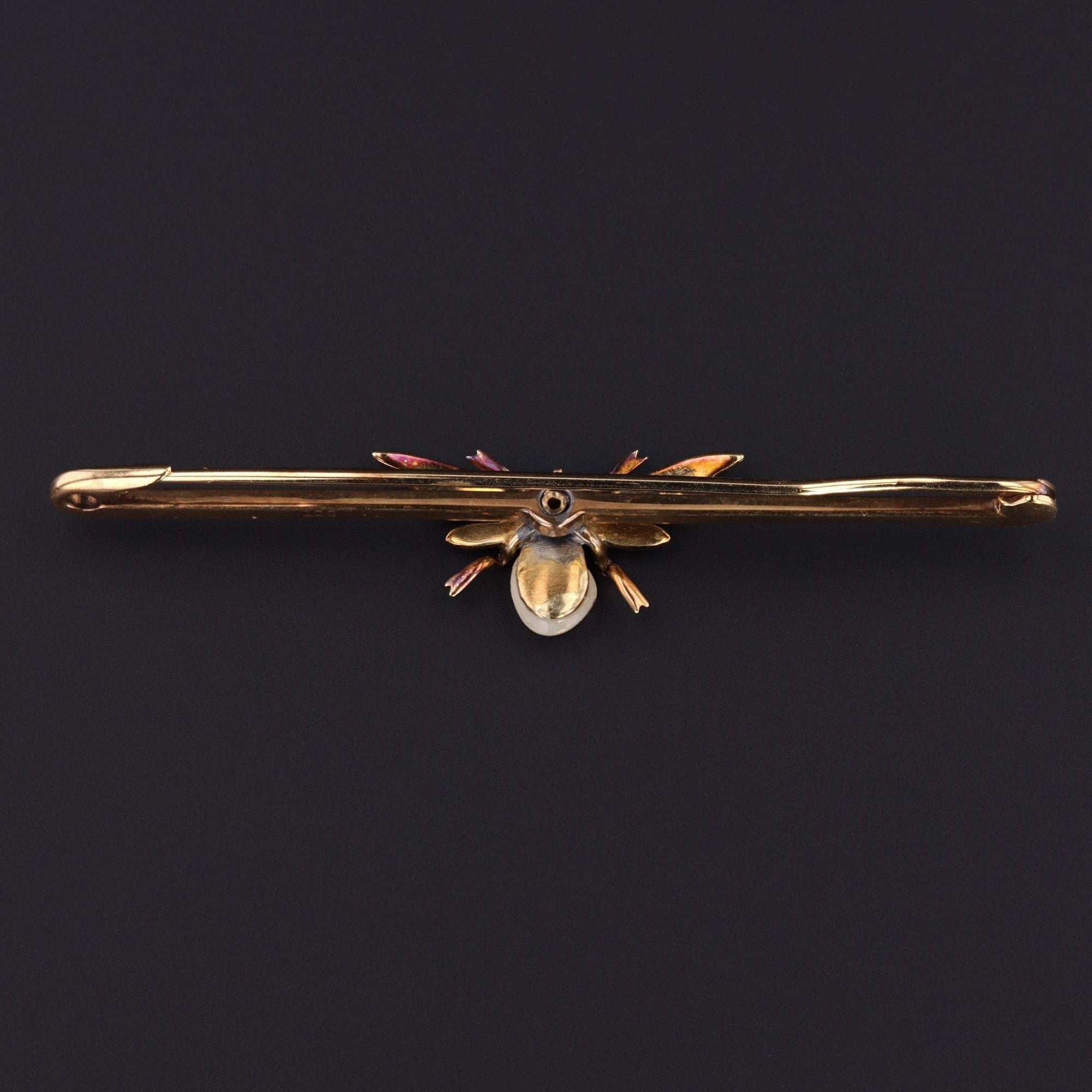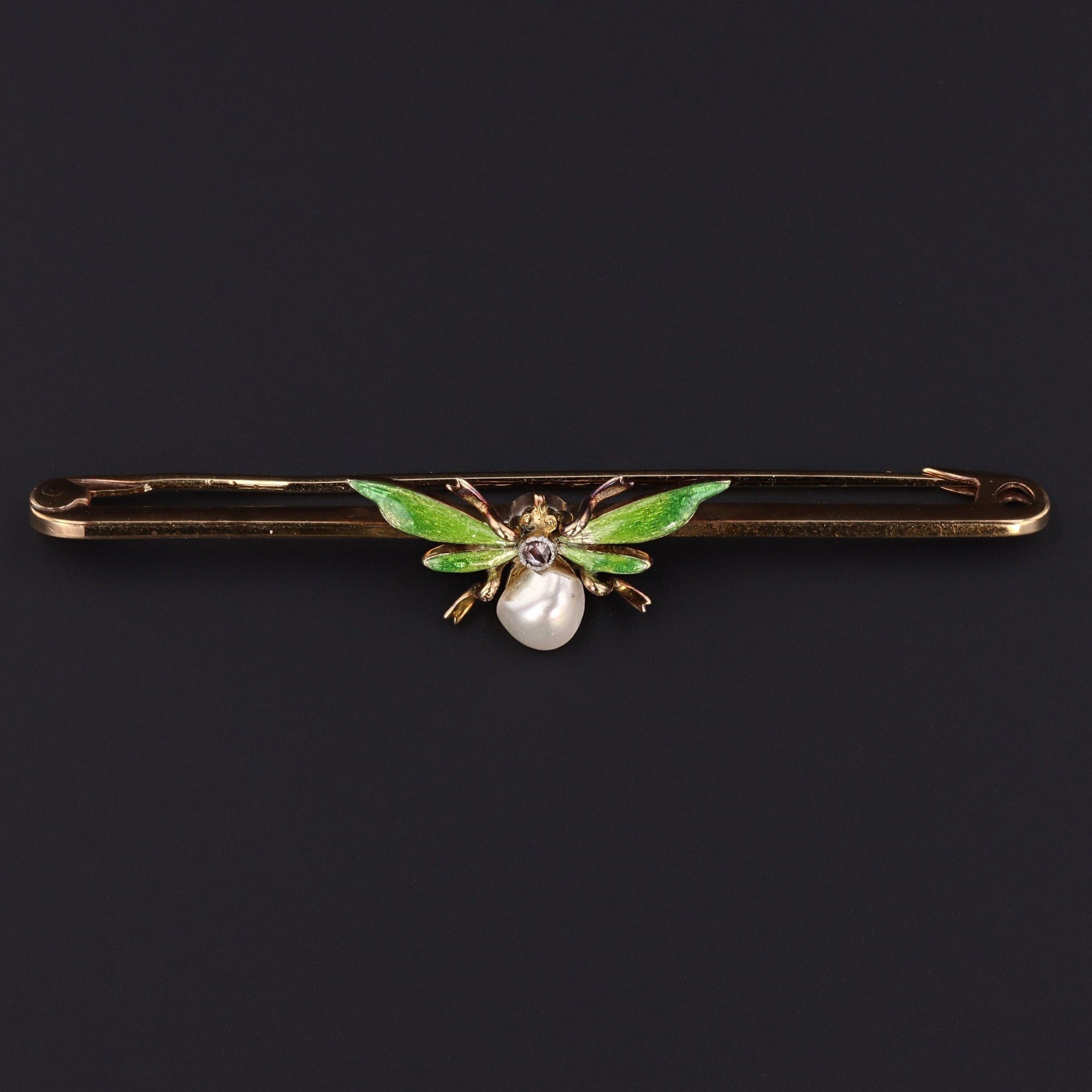 This whimsical pin features a pearl and rose cut diamond insect with green enamel wings. The 15ct gold pin measures 2.3 inches inches in width and is in good condition.
