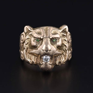 Commanding in presence and rich with symbolism, this antique ring showcases a lion’s head masterfully rendered in 10k gold, its ferocious jaws clenched around a sparkling diamond. Two vivid green paste (glass) eyes bring the creature to life, adding a bold flash of color and intensity. Lions have long symbolized strength, courage, and protection, making this a jewel of both artistry and meaning.