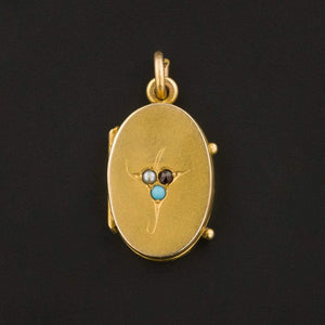 This charming locket is unmarked, but acid tests for 10k gold. The front is hand etched and adorned with a pearl, garnet, and turquoise glass cabochon.