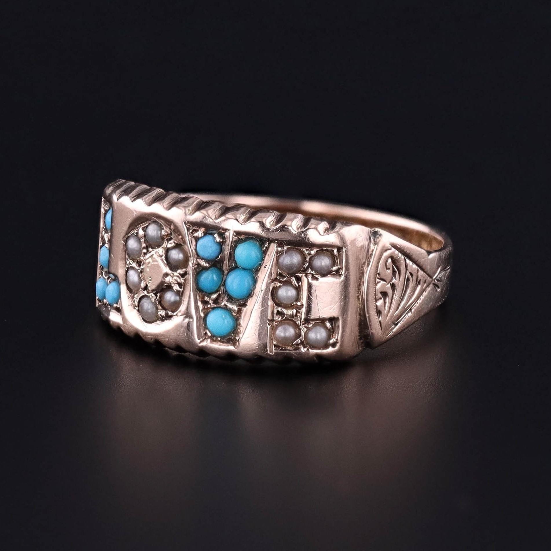 Antique Love Ring: This antique, 9ct gold ring features the word 'LOVE' in turquoise cabochons and half pearls. The ring was hallmarked in Chester, England in 1890.