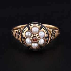 A beautiful mourning ring incorporating a pearl and red glass "forget-me-not" flower motif and black enamel that reads "In Memory Of."