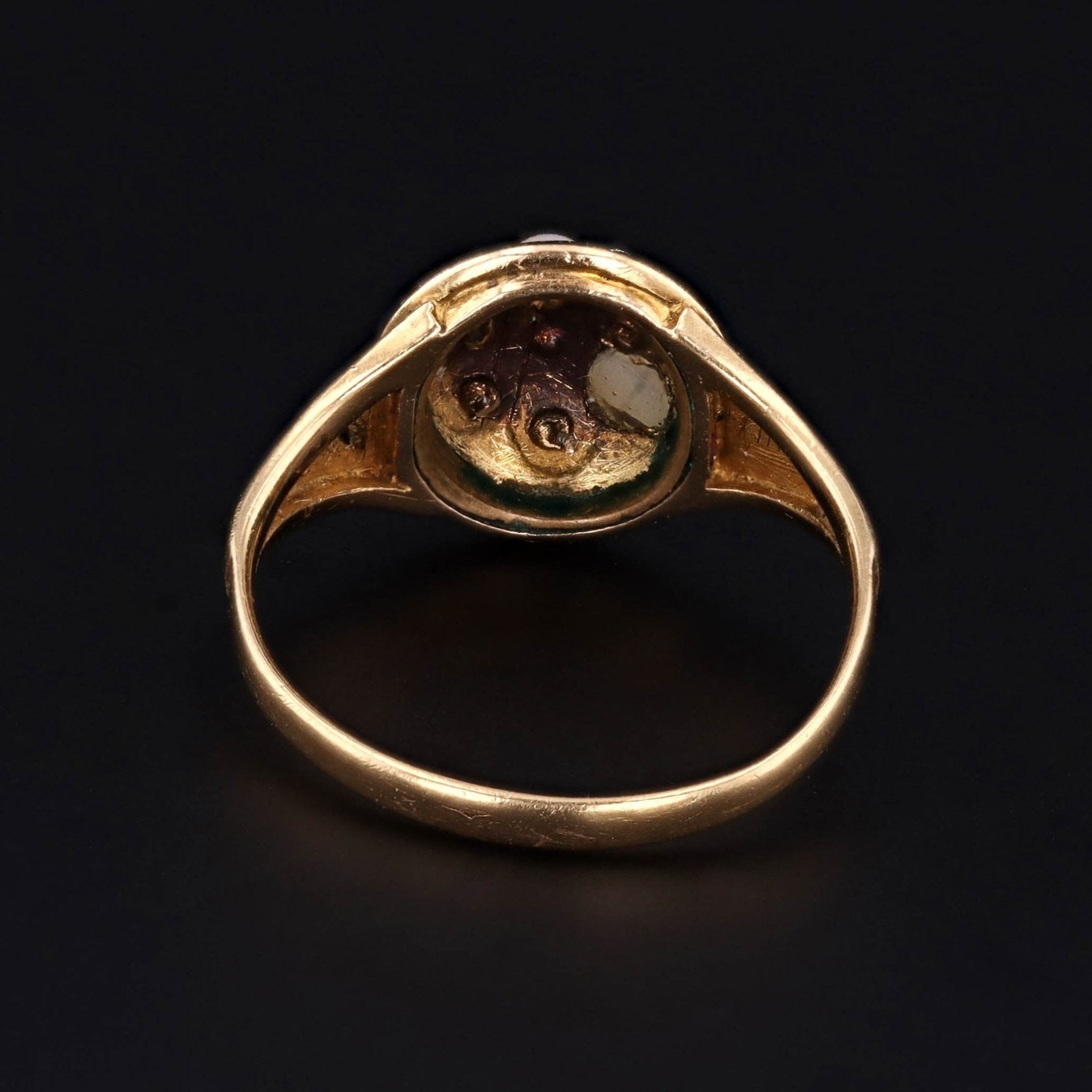 This ring is in good condition; however there is a slight bit of loss to the black enamel on the shoulders of the band and one of the pearls is a later replacement (added by carving a small hole on the underside of the ring).