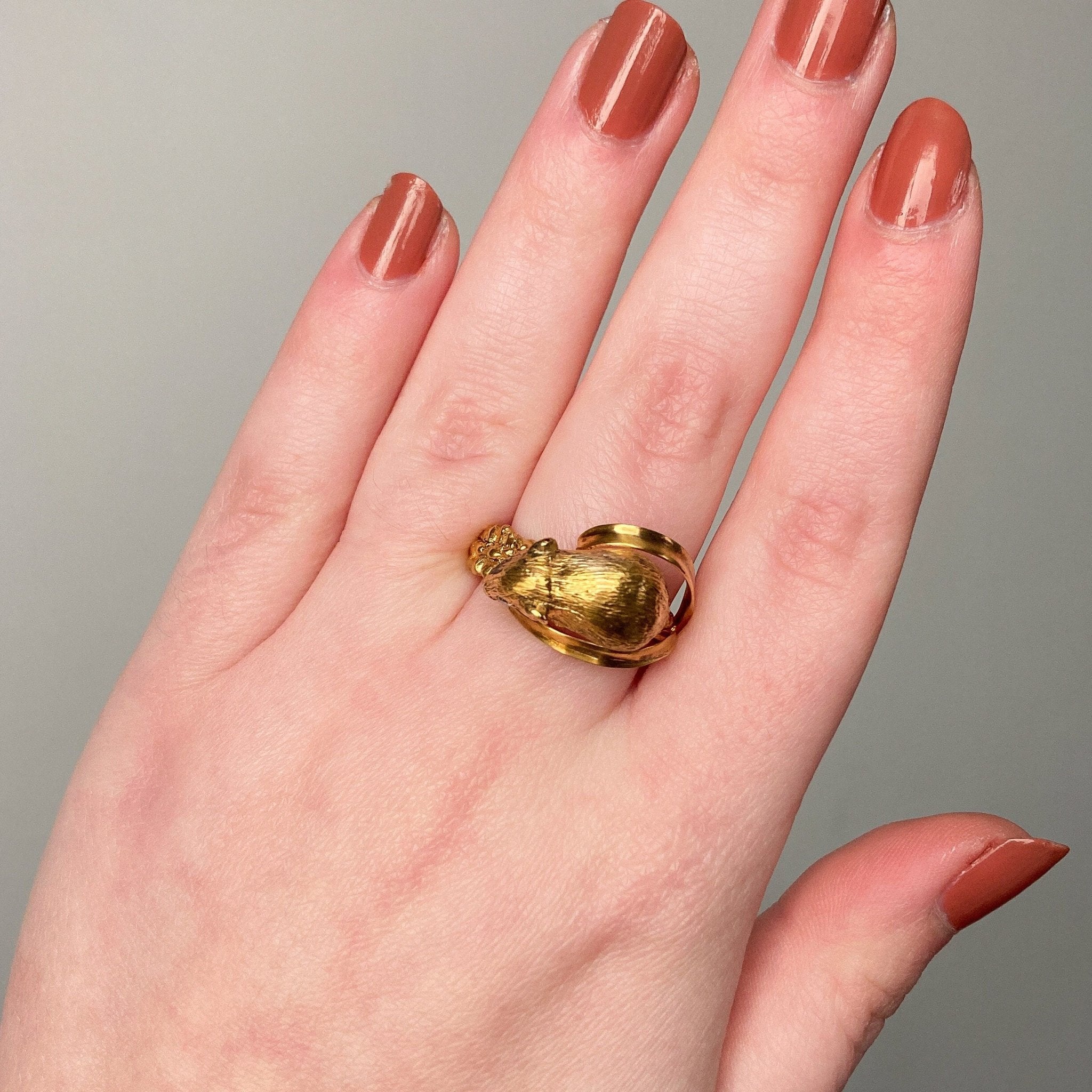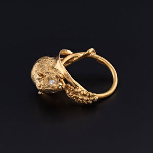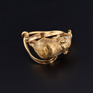 This vintage ring (circa 1960-1980) features a 10k gold mouse perched on an 18k gold band designed to look like a stalk of wheat. The mouse has two single cut diamond eyes.