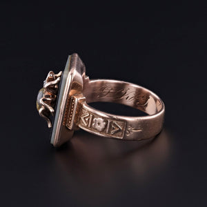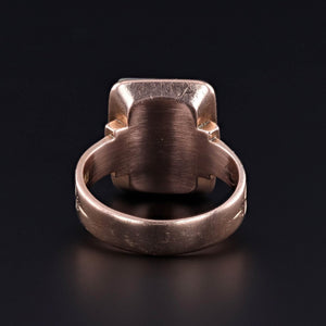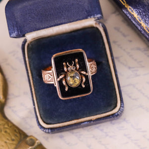 Dramatic, rare, and richly symbolic, this one-of-a-kind ring features a gold quartz insect with twinkling diamond eyes, artfully set atop a polished onyx backdrop. The insect—originally the head of a 14k gold Victorian stickpin (circa 1890)—has been masterfully riveted onto a bold 10k gold signet ring from the 1920s, creating a singular jewel that bridges two design eras with cohesion and flair.