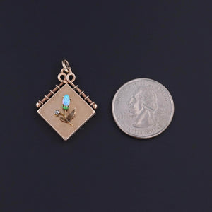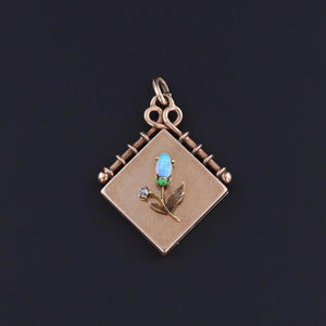 This charming antique locket combines two historic jewels into one elegant design. A flower motif of luminous opal petals with a diamond center (originally the head of a stickpin, circa 1890) has been skillfully riveted onto a 10k gold locket (circa 1910), creating a unique and harmonious composition.