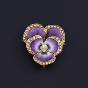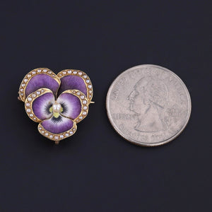 This exquisite early 20th-century brooch captures the enduring charm of the pansy, a flower long associated with love and remembrance. Rendered in rich, deep purple enamel, the petals are delicately edged with a border of luminous half pearls, while a larger post-set pearl gleams at the center—creating a jewel of both beauty and symbolism.