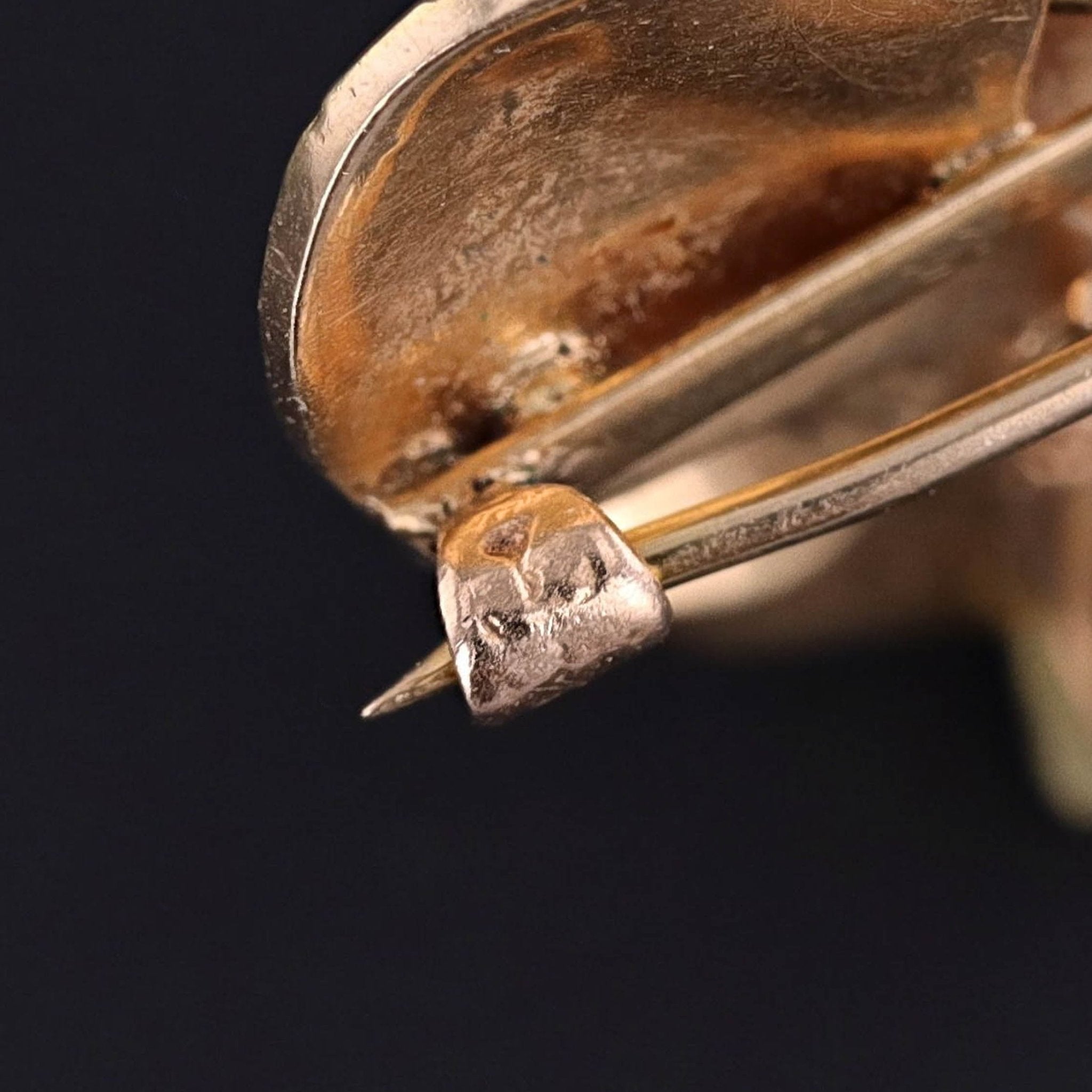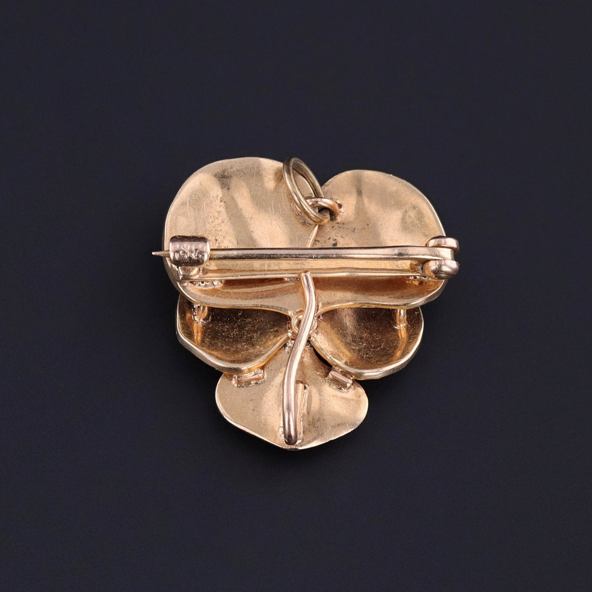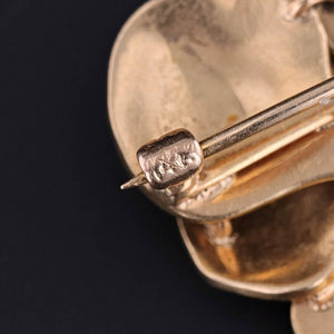 Crafted in solid 14k gold, the brooch measures 0.9 inches from top to bottom by 0.8 inches wide. It remains in great condition, with only a single minor chip to the enamel on the top left petal (visible only under magnification). The reverse bears the maker’s mark for Krementz & Company of Newark, NJ, one of America’s most celebrated jewelry houses of the era, renowned for its enamel work and finely wrought designs.