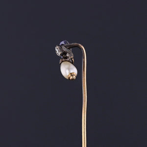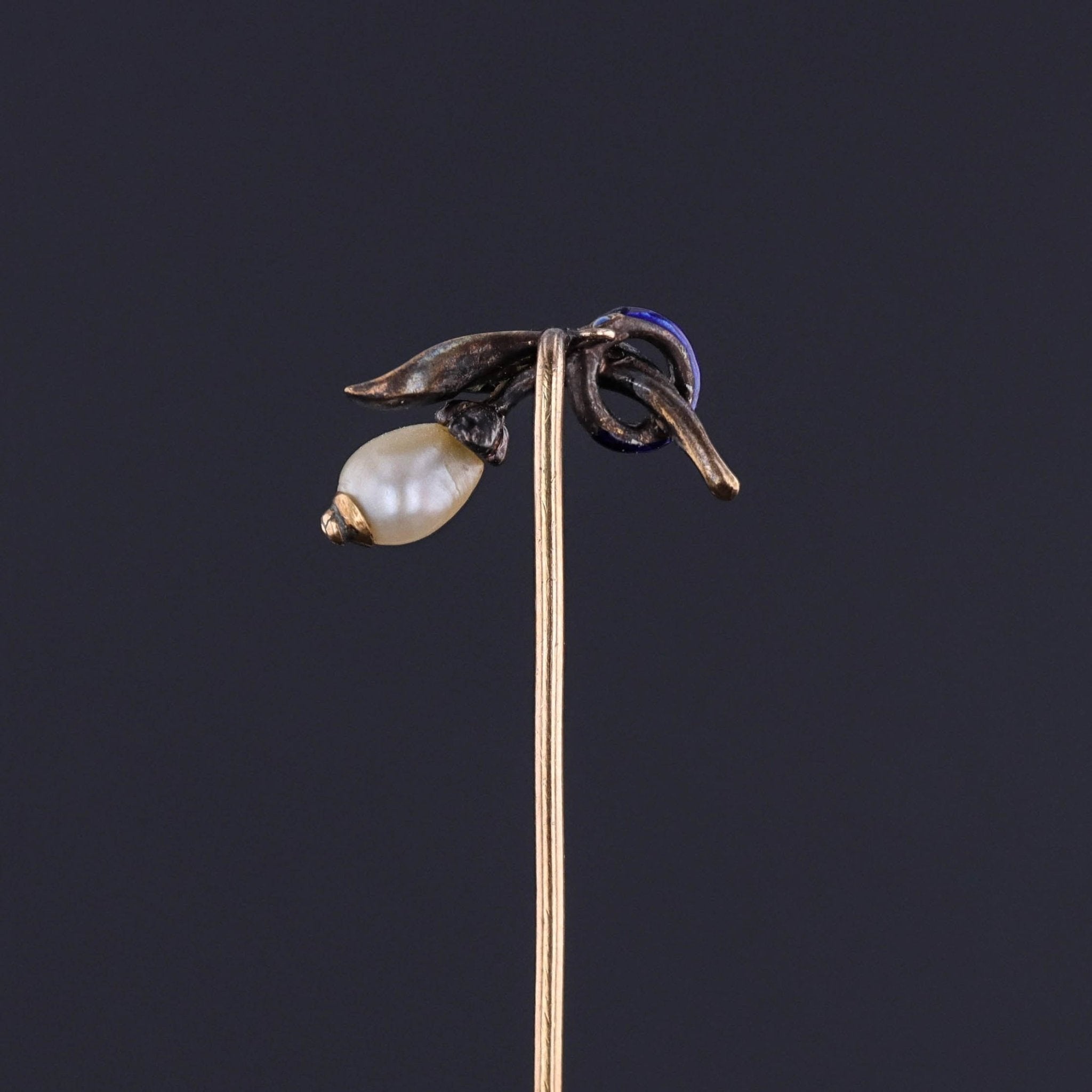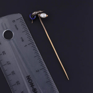 This elegant stickpin (circa 1800–1840) dates to the late Georgian to early Victorian era, a period celebrated for its refinement and symbolic jewelry. The design features a luminous pearl accompanied by diamonds and accented with royal blue enamel, creating a jewel that balances delicacy with presence.