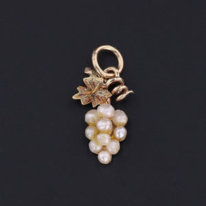 The whimsical 10k gold charm (circa 1890-1910) was originally an antique stick pin transformed with a gold jump ring bail. The charm features a cluster of pearl grapes with a textured golden leaf and tiny curled vine.