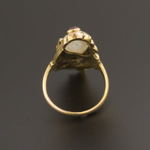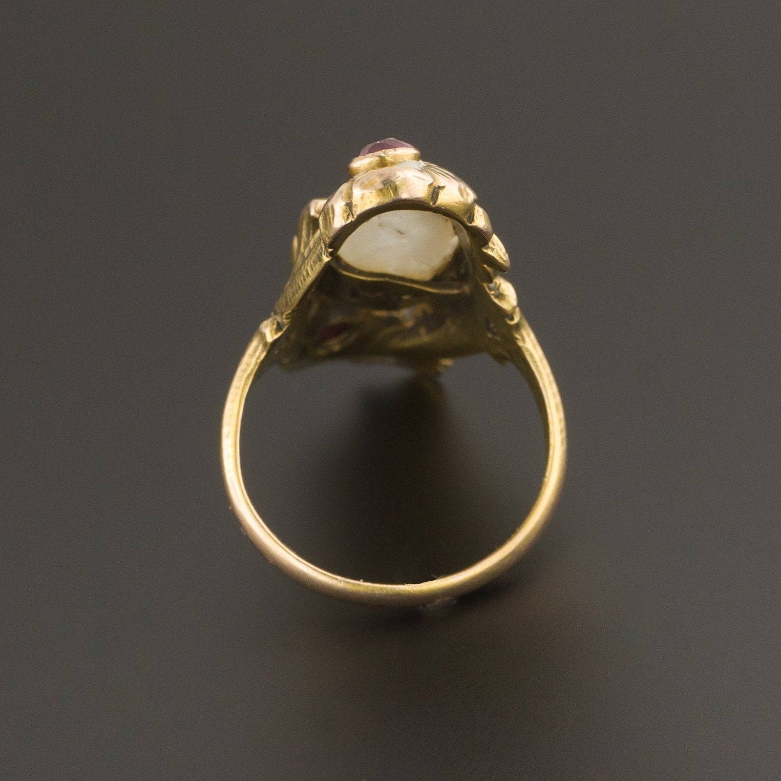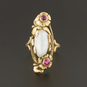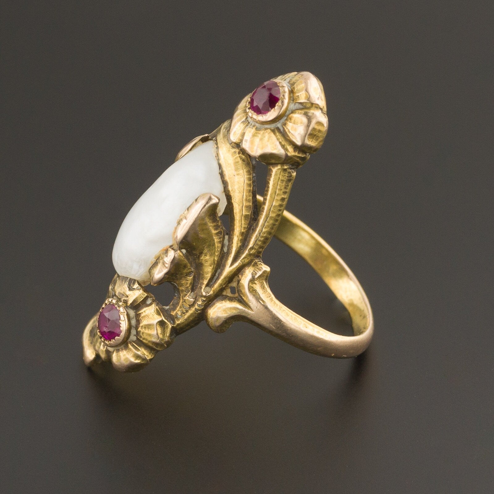This antique Art Nouveau era ring (circa 1910-1920) features a baroque pearl set into an ornate 10k yellow gold mounting accented with two vibrant red rubies.
