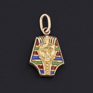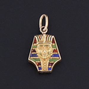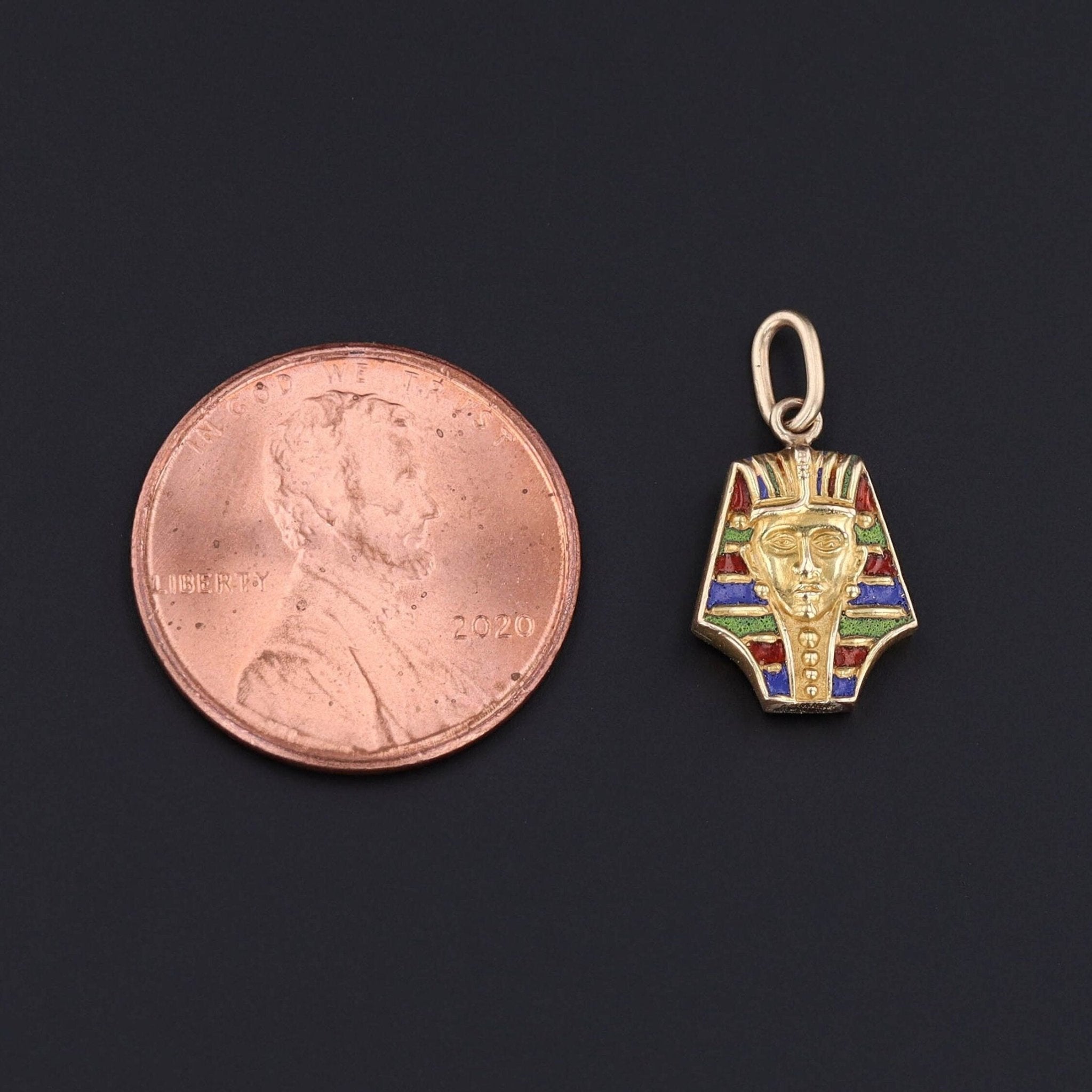 Rich in detail and symbolism, this double-sided antique charm (circa 1910) features a regal pharaoh motif, beautifully rendered in solid 14k gold and adorned with vibrant red, blue, and green enamel. With exquisite detailing on both sides, this charm is a striking tribute to ancient history and early 20th-century craftsmanship.