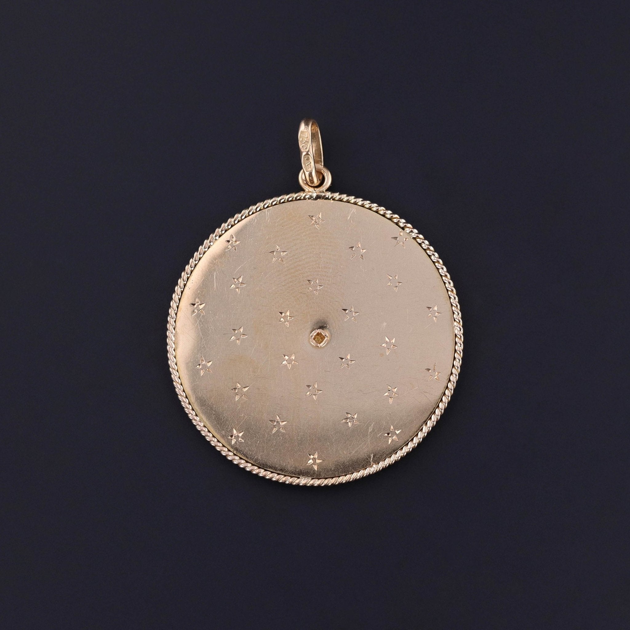 Antique Pierrot Pendant : An alluring medallion featuring Pierrot seated on a crescent moon. The pendant is hand etched with tiny stars and crafted of 18k yellow and rose gold.