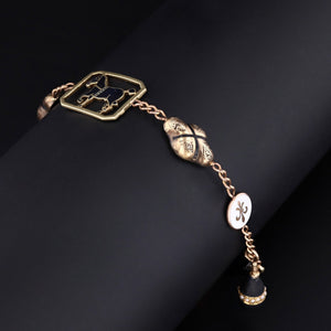 The elegant bracelet features seven stations and a tiny black enamel and pearl dangle. The chain is 14k gold and the stations are a mixture of 10k and 14k gold.