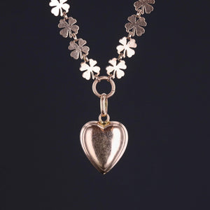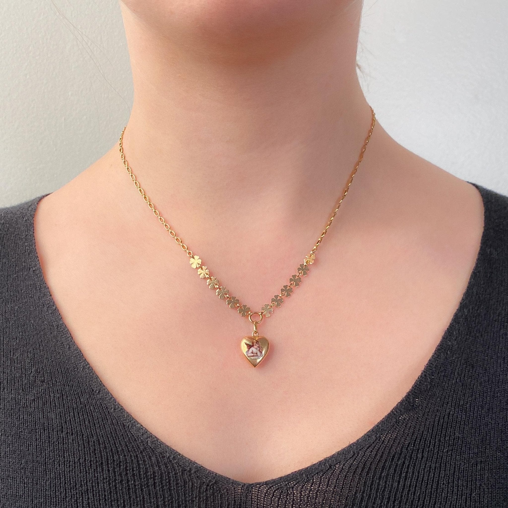 Antique Cherub Necklace: This necklace features a 15ct gold puffy heart adorned with an enamel cherub dangling from a gold chain. The chain is comprised of 14k gold oval shaped links and 12ct gold clover shaped links -- the links were originally part of two different antique chains.