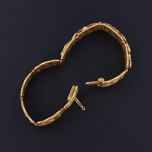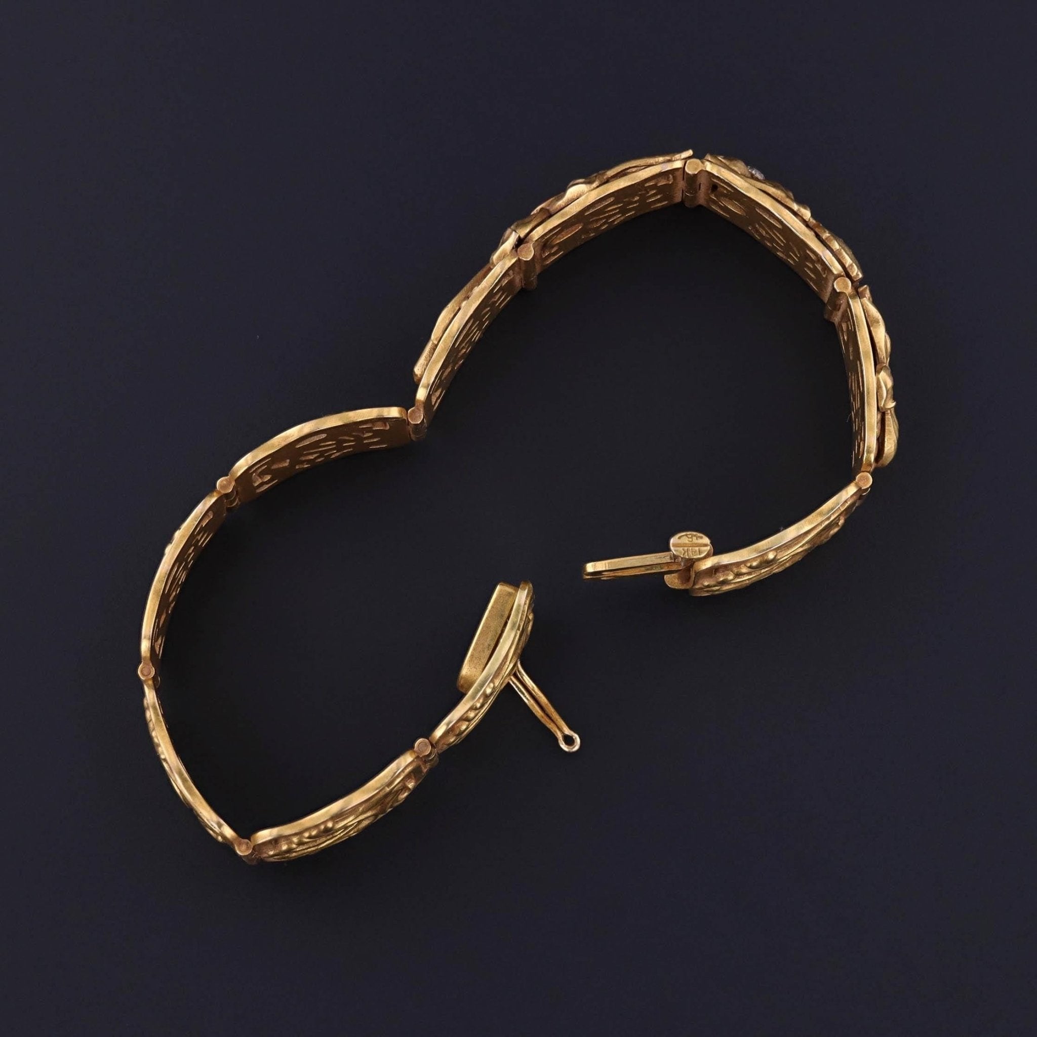 The bracelet measures approximately 0.6 inches wide by 6.5 inches long and boasts a substantial weight of 40.9 grams, offering an opulent presence on the wrist. It remains in excellent antique condition, with the clasp bearing the distinctive Riker maker’s mark, a testament to its storied provenance. The underside of the clasp also bears hand-engraved initials, adding a touch of personal history and character.