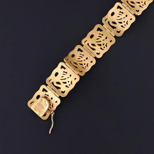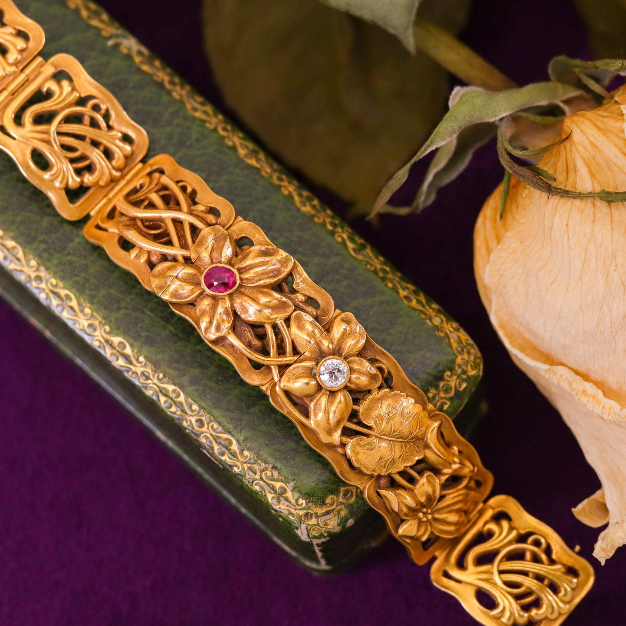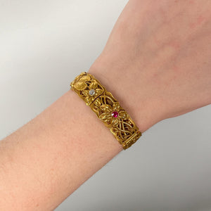 Exquisitely hand-fabricated in solid 14k gold, the bracelet features a series of intricately detailed floral plaques, each a miniature work of art. At its center glows a vivid purplish-red natural ruby, unheated and richly saturated, paired with a sparkling 0.17ct old European-cut diamond of E–F color and VS2 clarity. Together, these gemstones embody the refined taste and luxurious sensibility of turn-of-the-century fine jewelry.