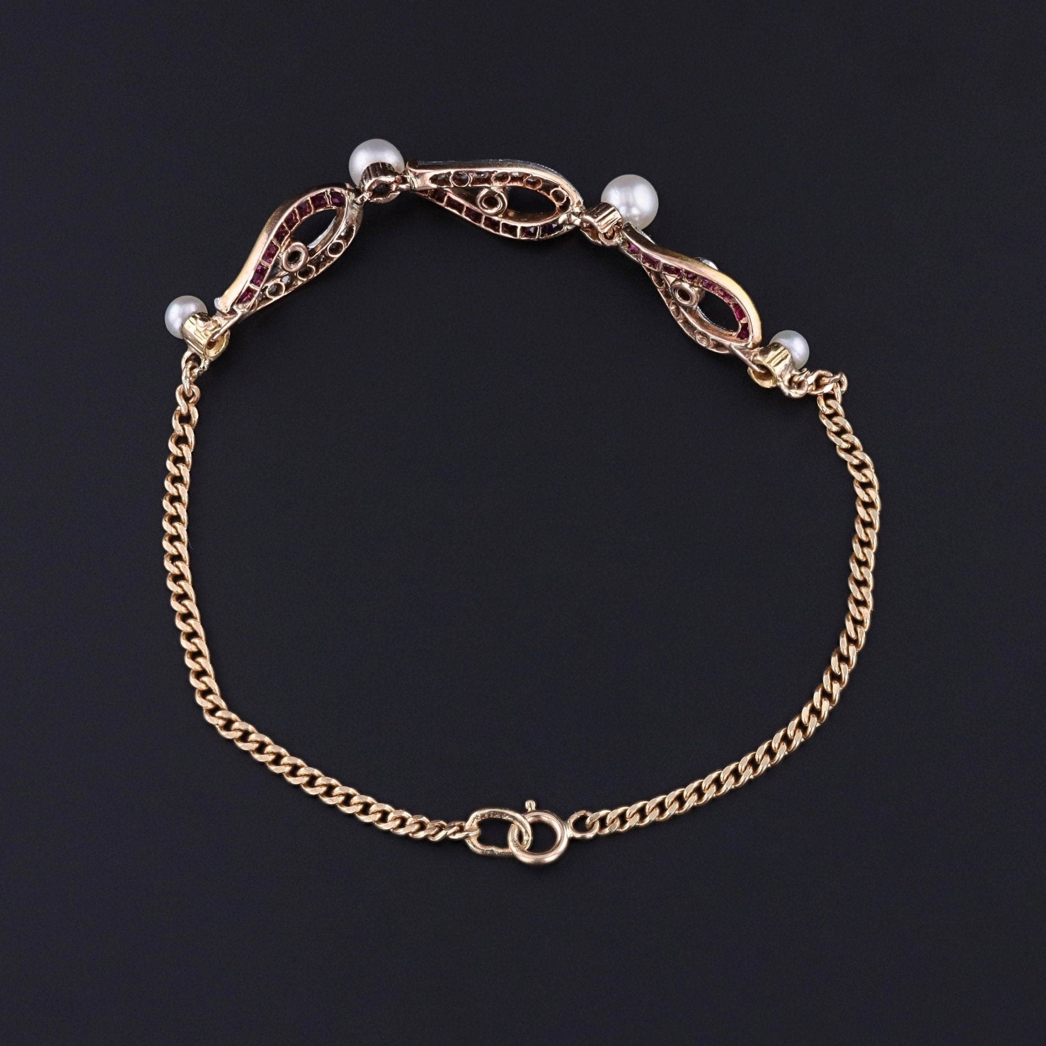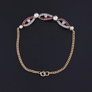 Antique Ruby, Diamond, and Pearl Bracelet: Transport yourself to the turn of the 20th century with this exquisite antique bracelet from 1900-1910, boasting a helix design accented with rose cut diamonds and natural channel set rubies, interspersed with four pearls. Set in platinum-topped 14k gold, this piece exudes timeless elegance and sophistication, perfect for adding a touch of vintage luxury to any ensemble.