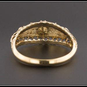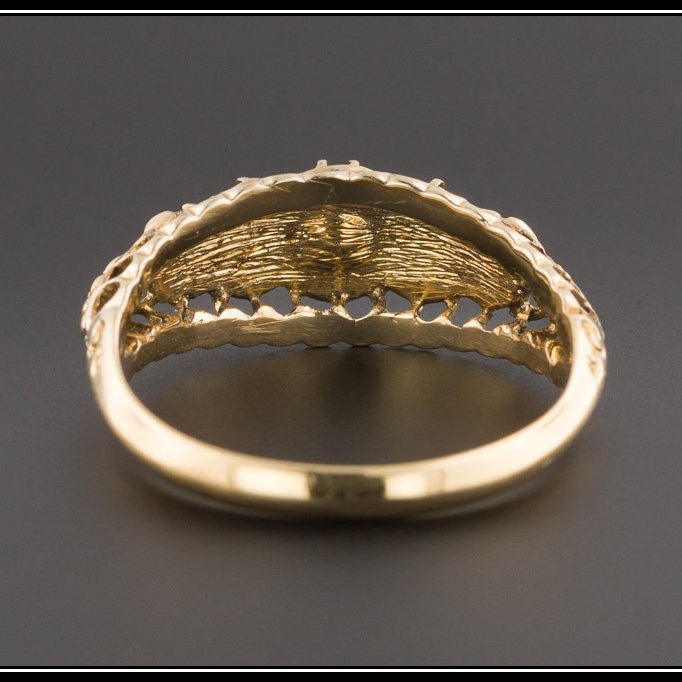 This cheery ring features colorful natural rubies, rose cut diamonds and an emerald set in a boat shaped 14k yellow gold bezel. The gemstones are closed back and set atop an open work gallery.
