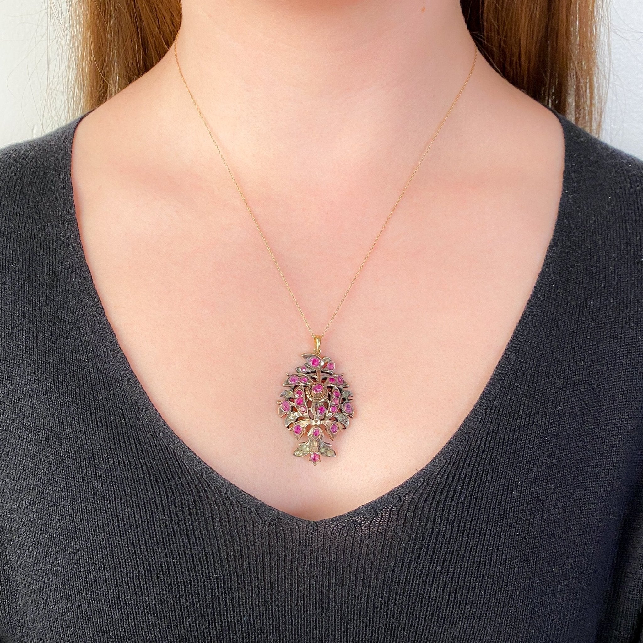 Crafted in silver gilt with rich gold accents, the piece blooms with a stylized floral motif, adorned with vibrant natural pink rubies and sparkling rose cut jargoons. The result is a glittering blend of color, light, and intricate texture, characteristic of high craftsmanship from the colonial-era Ceylon region.